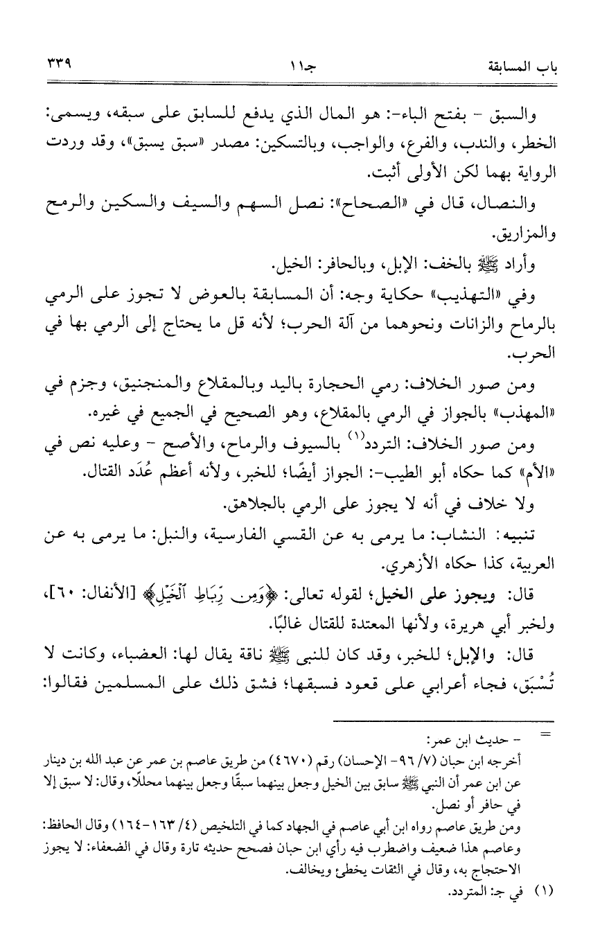 قال: والإبل؛ للخبر، وقد كان للنبي صلى الله عليه وسلم ناقة يقال لها: العضباء، وكانت لا تسبق، فجاء أعرابي على قعود فسبقها؛ فشق ذلك على المسلمين فقالوا:
