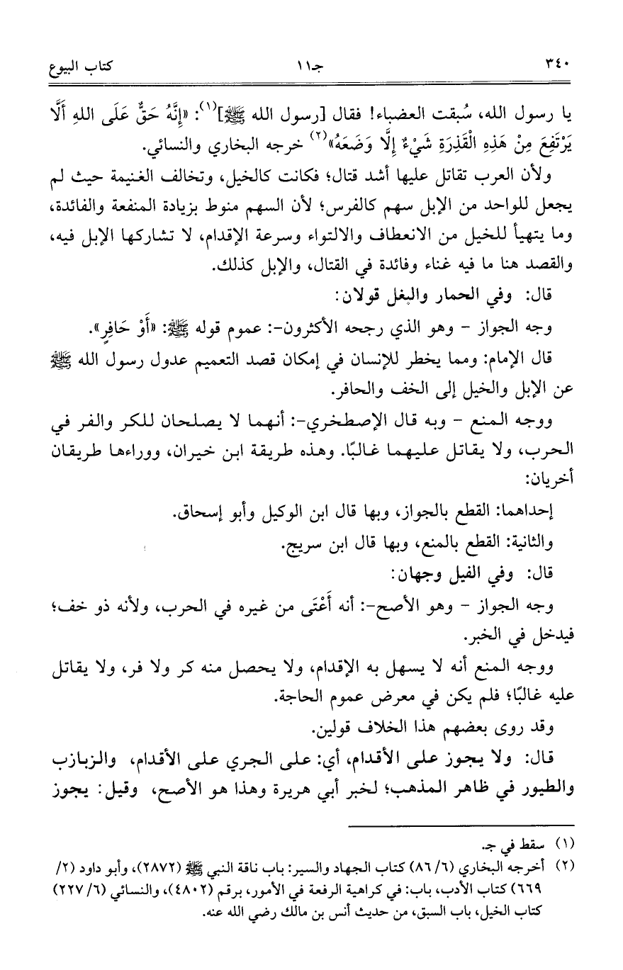 ولأن العرب تقاتل عليها أشد قتال؛ فكانت كالخيل، وتخالف الغنيمة حيث لم يجعل للواحد من الإبل سهم كالفرس؛ لأن السهم منوط بزيادة المنفعة والفائدة، وما يتهيأ للخيل من الانعطاف والالتواء وسرعة الإقدام، لا تشاركها الإبل فيه، والقصد هنا ما فيه غناء وفائدة في القتال، والإبل كذلك.