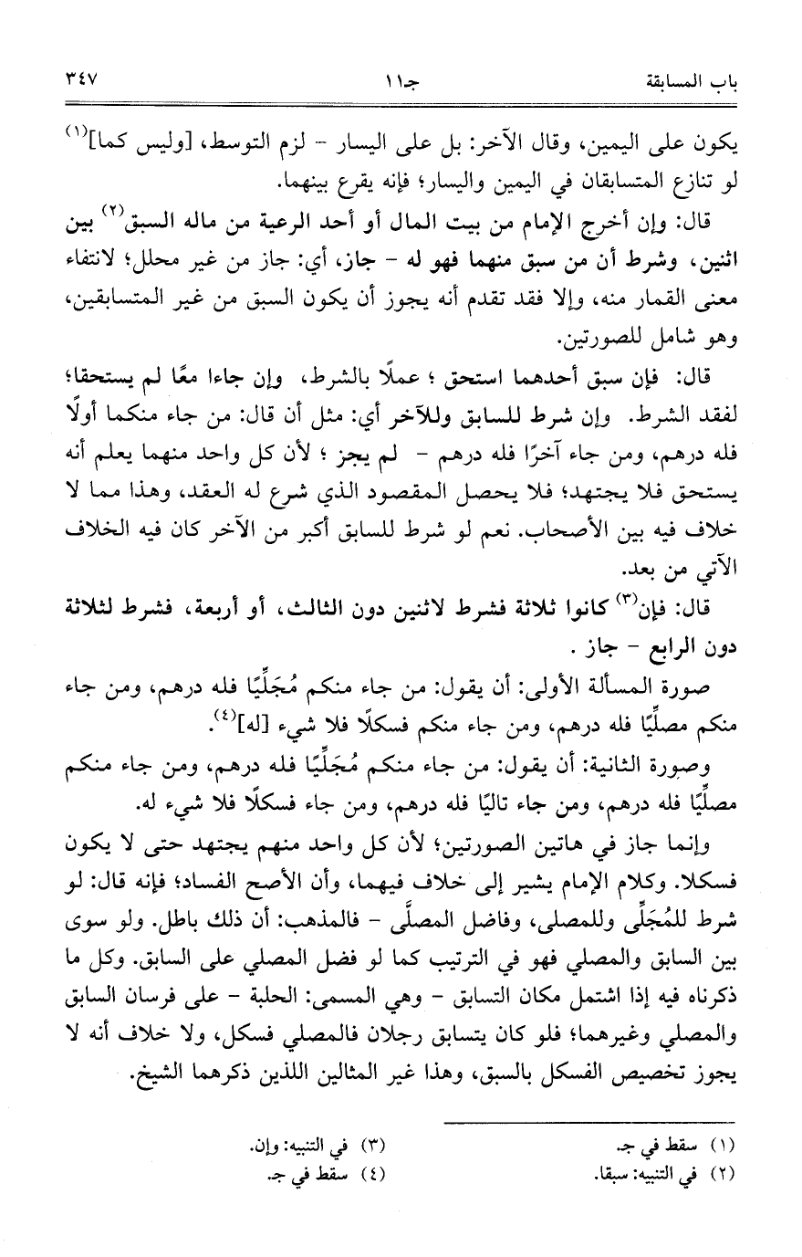 وإنما جاز في هاتين الصورتين؛ لأن كل واحد منهم يجتهد حتى لا يكون فسكلاً. وكلام الإمام يشير إلى خلاف فيهما، وأن الأصح الفساد؛ فإنه قال: لو شرط للمجلي وللمصلي، وفاضل المصلى- فالمذهب: أن ذلك باطل. ولو سوى بين السابق والمصلي فهو في الترتيب كما لو فضل المصلي على السابق. وكل ما ذكرناه فيه إذا اشتمل مكان التسابق- وهي المسمى: الحلبة- على فرسان السابق والمصلي وغيرهما؛ فلو كان يتسابق رجلان فالمصلي فسكل، ولا خلاف أنه لا يجوز تخصيص الفسكل بالسبق، وهذا غير المثالين اللذين ذكرهما الشيخ.