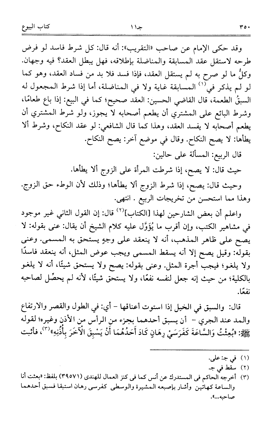 قال: والسبق في الخيل إذا استوت أعناقها- أي: في الطول والقصر والارتفاع والمد عند الجري- أن يسبق أحدهما بجزء من الرأس من الأذن وغيره؛ لقوله صلى الله عليه وسلم: "بُعِثْتُ وَالسَّاعَةَ كَفَرَسَيْ رِهَانٍ كَادَ أَحَدُهُمَا أَنْ يَسْبِقَ الآخَرَ بِأُذُنِهِ"، فأثبت