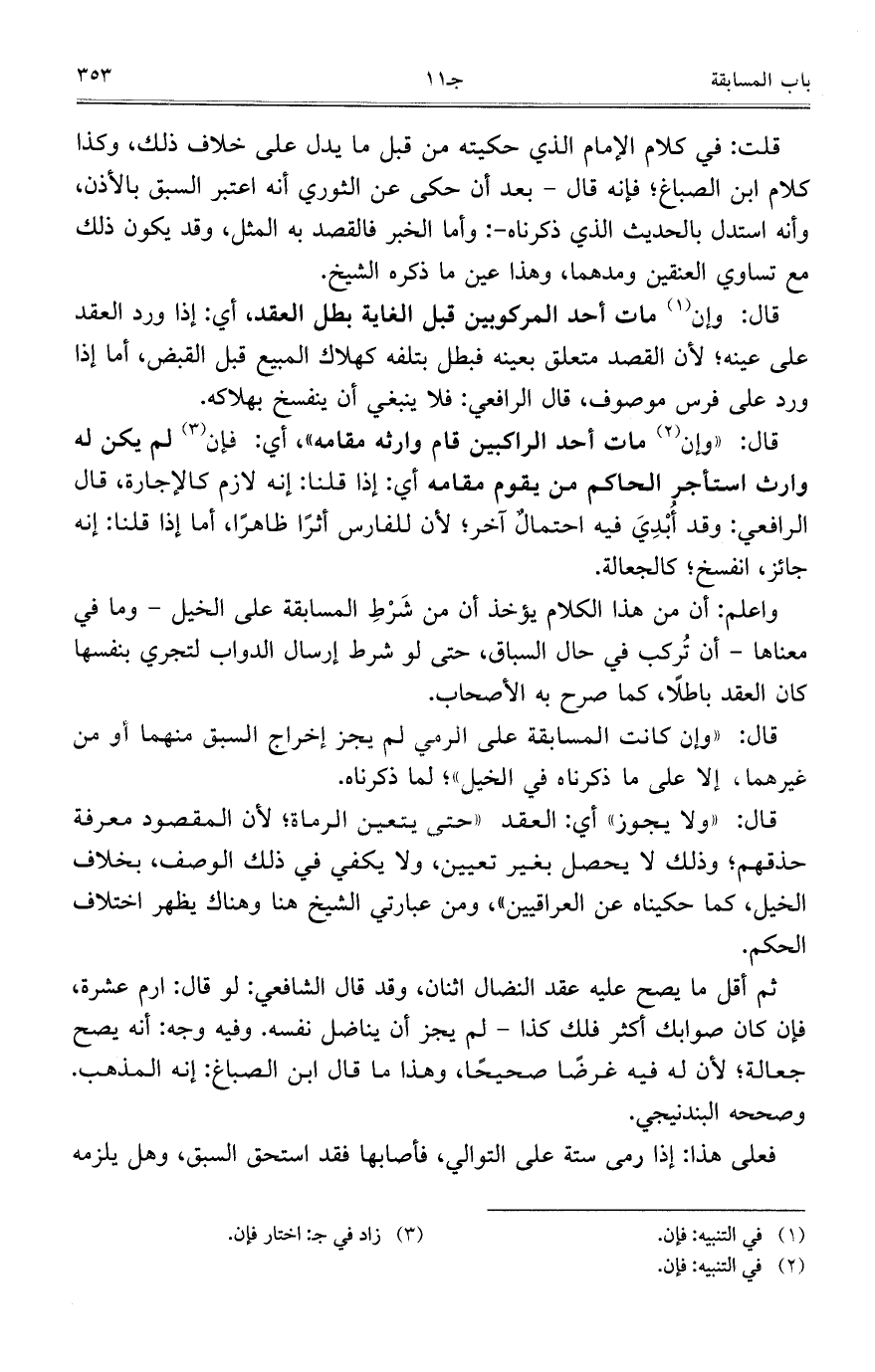 قلت: في كلام الإمام الذي حكيته من قبل ما يدل على خلاف ذلك، وكذا كلام اب الصباغ؛ فإنه قال- بعد أن حكى عن الثوري أنه اعتبر السبق بالأذن، وأنه استدل بالحديث الذي ذكرناه-: وأما الخبر فالقصد به المثل، وقد يكون ذلك مع تساوي العنقين ومدهما، وهذا عين ما ذكره الشيخ.