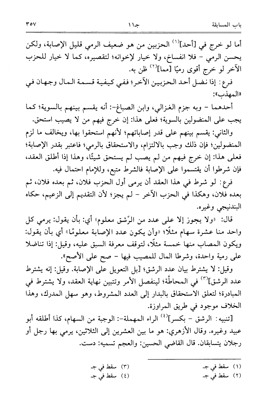وقيل: لا يشترط بيان عدد الرشق؛ [بل التعويل على الإصابة. وقيل: إنه يشترط عدد الرشق] في المحاطة؛ لينفصل الأمر وتتبين نهاية العقد، ولا يشترط في المبادرة؛ لتعلق الاستحقاق بالبدار إلى العدد المشروط، وهو سهل المدرك، وهذا الخلاف موجود في طريق المراوزة.