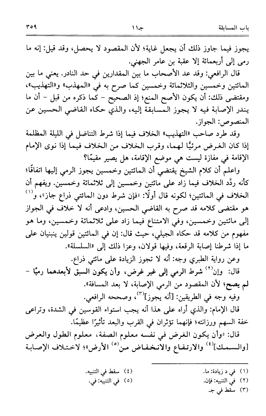 قال الرافعي: وقد عد الأصحاب ما بين المقدارين في حد النادر. يعني ما بين المائتين وخمسين والثلاثمائة وخمسين كما صرح به في "المهذب" و"التهذيب"، ومقتضى ذلك: أن يكون الأصح المنع؛ إذ الصحيح – كما ذكره من قبل- أن ما يندر الإصابة فيه لا يجوز المسابقة إليه، والذي حكاه القاضي الحسين عن المنصوص: الجواز.