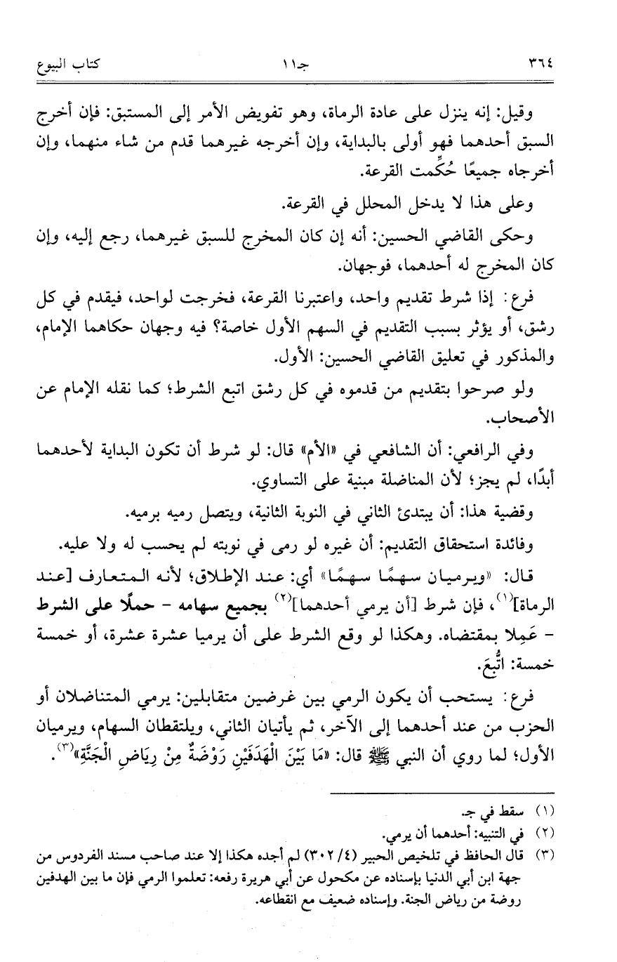 وفي الرافعي: أن الشافعي في "الأم" قال: لو شرط أن تكون البداية لأحدهما أبداً، لم يجز؛ لأن المناضلة مبنية على التساوي.