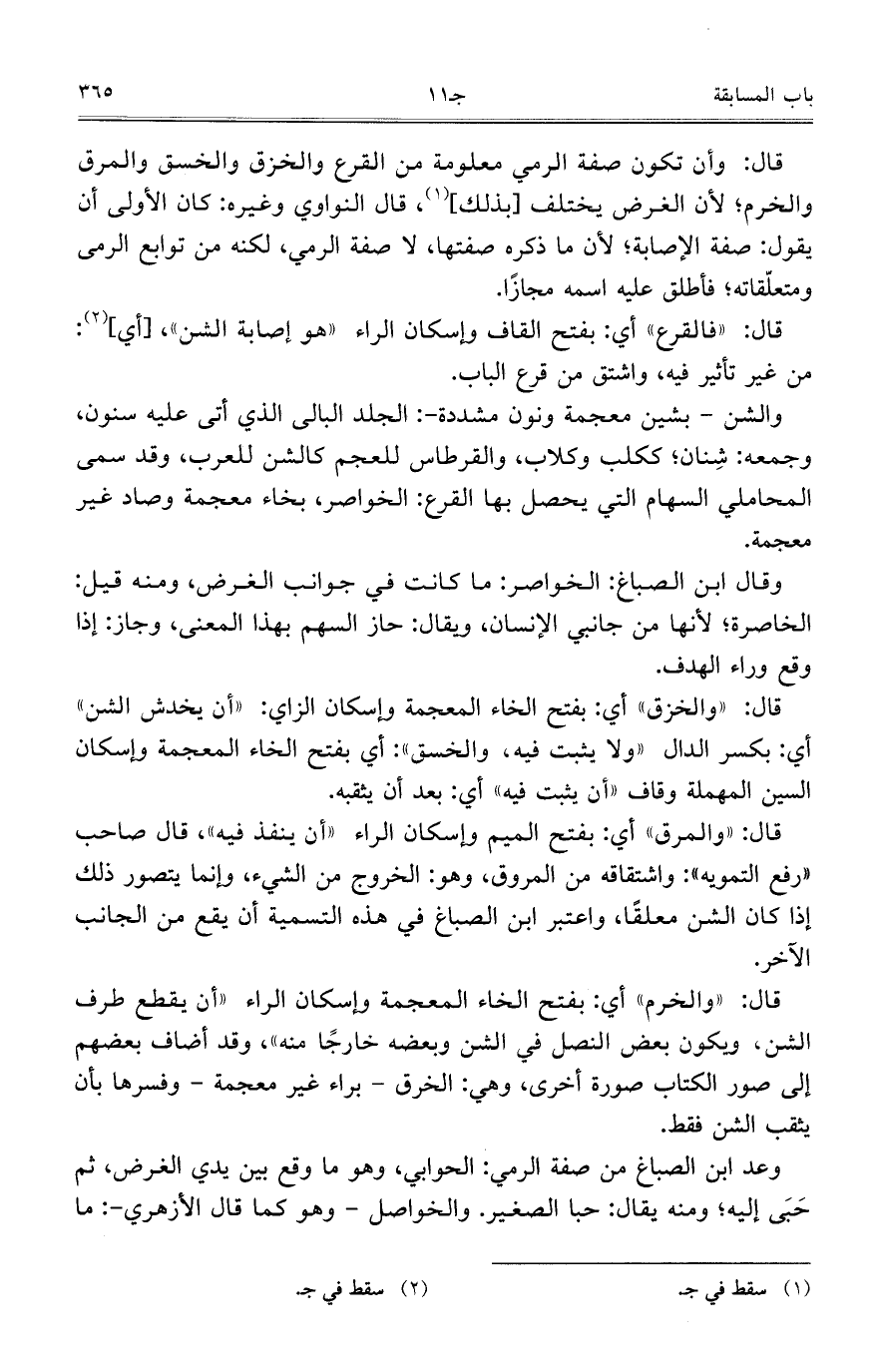 قال: "والخرم" أي: بفتح الخاء المعجمة وإسكان الراء "أن يقطع طرف الشن، ويكون بعض النصل في الشن وبعضه خارجاص منه"، وقد أضاف بعضهم إلى صور الكتاب صورة أخرى، وهي: الخرق- براء غير معجمة- وفسرها بأن يثقب الشن فقط.