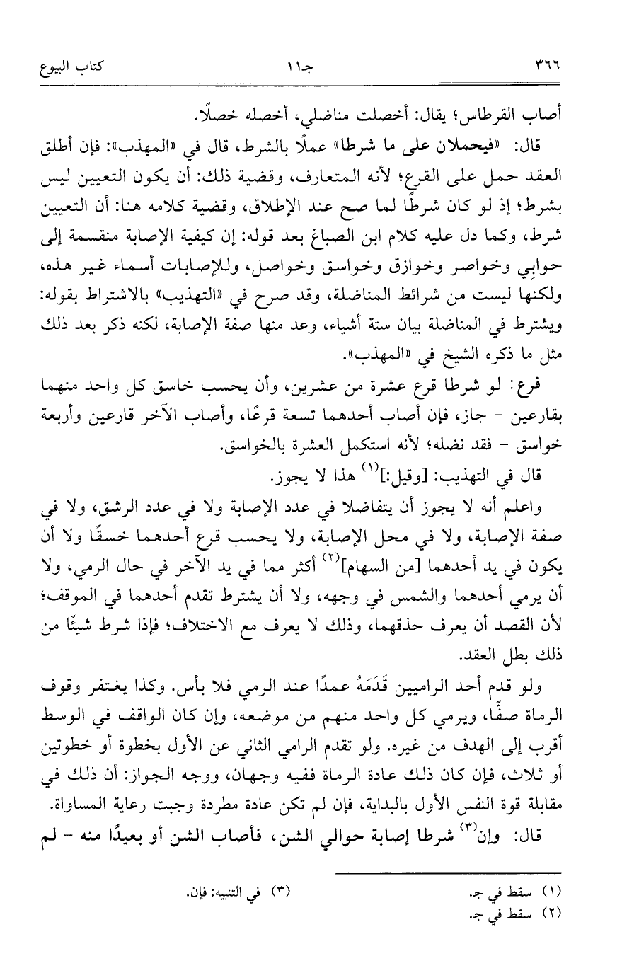 واعلم أنه لا يجوز أن يتفاضلا في عدد الإصابة ولا في عدد الرشق، ولا في صفة الإصابة، ولا في محل الإصابة، ولا يحسب قرع أحدهما خسقاً ولا أن يكون في يد أحدهما [من السهام] أكثر مما في يد الآخر في حال الرمي، ولا أن يرمي أحدهام والشمس في وجهه، ولا أن يشترط تقدم أحدهما في الموقف؛ لأن القصد أن يعرف حذقهما، وذلك لا يعرف مع الاختلاف؛ فإذا شرط شيئاً من ذلك بطل العقد.