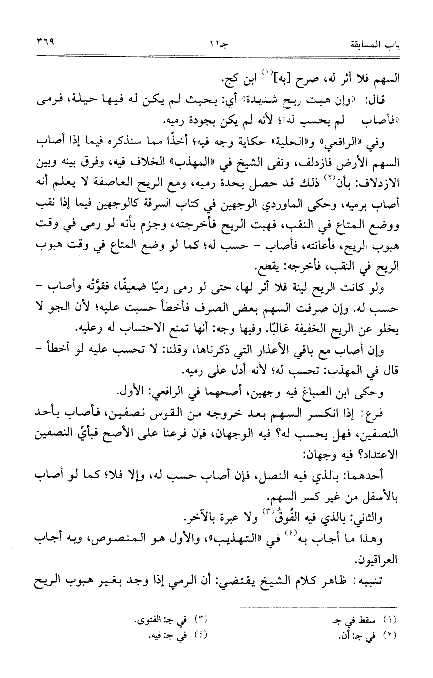 وفي "الرافعي" و"الحلية" حكاية وجه فيه؛ أخذاً مما سنذكره فيما إذا أصاب السهم ارض فازدلف، ونفى الشيخ في "المهذب" الخلاف فيه، وفرق بينه وبين الازدلاف: بأن ذلك قد حصل بحدة رميه، ومع الريح العاصفة لا يعلم أنه أصاب برميه، وحكى الماوردي الوجهين في كتاب السرقة كالوجهين فيما إذا نقب ووضع المتاع في النقب، فهبت الريح فأخرجته، وجزم بأنه لو رمى في وقت هبوب الريح، فأعانته، فأصاب- حسب له؛ كما لو وضع المتاع في وقت هبوب الريح في النقب، فأخرجه: يقطع.
