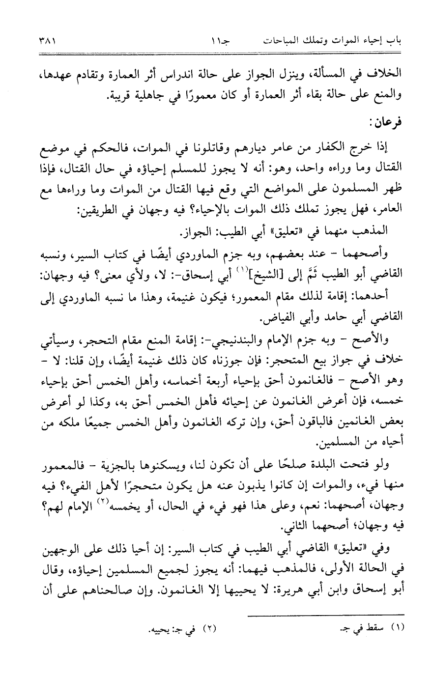 إذا خرج الكفار من عامر ديارهم وقاتلونا في الموات، فالحكم في موضع القتال وما وراءه واحد، وهو: أنه لا يجوز للمسلم إحياؤه في حال القتال، فإذا ظهر المسلمون على المواضع التي وقع فيها القتال من الموات وما وراءها مع العامر، فهل يجوز تملك ذلك الموات بالإحياء؟ فيه وجهان في الطريقين: