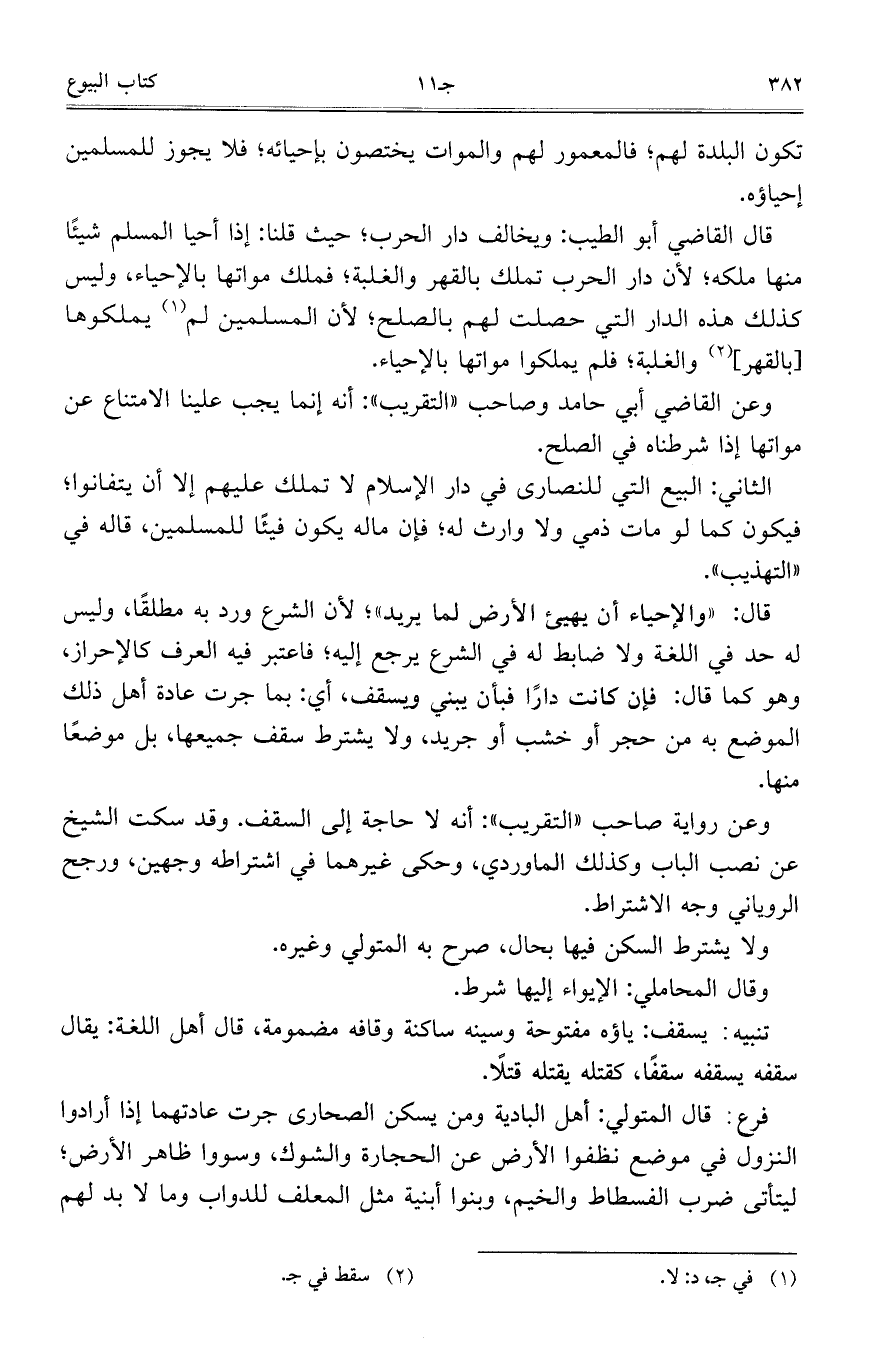 قال القاضي أبو الطيب: ويخالف دار الحرب؛ حيث قلنا: إذا أحيا المسلم شيئاً منها ملكه؛ لأن دار الحرب تملك بالقهر والغلبة؛ فملك مواتها بالإحياء، وليس كذلك هذه الدار التي حصلت لهم بالصلح؛ لأن المسلمين لم يملكوها [بالقهر] والغلبة؛ فلم يملكوا مواتها بالإحياء.