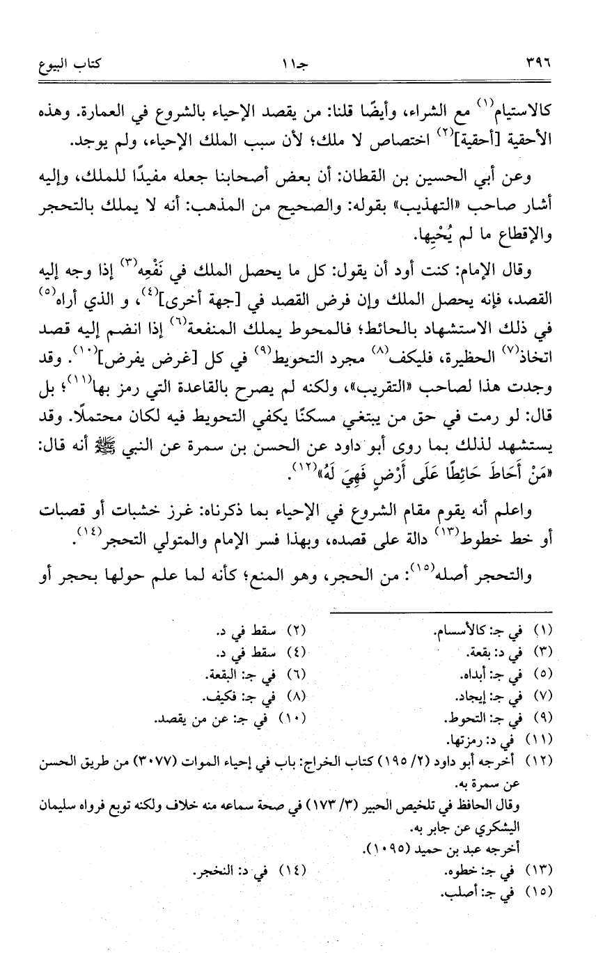 وقال الإمام: كنت أود أن يقول: كل ما يحصل الملك في نفعه إذا وجه إليه القصد، فإنه يحصل الملك وإن فرض القصد في [جهة أخرى]، والذي أراه في ذلك الاستشهاد بالحائط؛ فالمحوط يملك المنفعة إذا انضم إليه قصد اتخاذ الحظيرة، فليكف مجرد التحويط في كل [غرض يفرض]. وقد وجدت هذا لصاحب "التقريب"، ولكنه لم يصرح بالقاعدة التي رمز بها؛ بل قال: لو رمت في حق من يبتغي مسكناً يكفي التحويط فيه لكان محتملاً. وقد يستشهد لذلك بما روى أبو داود عن الحسن بن سمرة عن النبي صلى الله عليه وسلم أنه قال: "مَنْ أَحَاطَ حَائِطاً عَلَى أَرْضٍ فَهِيَ لَهُ".