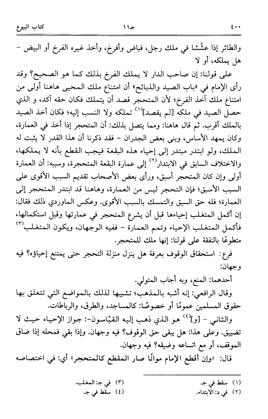 على قولنا: إن صاحب الدار لا يملك الفرخ بذلك كما هو الصحيح؟ وقد رأى الإمام في "باب الصيد والذبائح" أن امتناع ملك المحيى هاهنا أولى من امتناع ملك آخذ الفرخ؛ لأن المتحجر قصد أن يتملك فكان حقه آكد، والذي حصل الصيد في ملكه [لم يقصد] تملكه ولا النسب إليه؛ فكان أخذ الصيد بالملك أقرب. ثم قال هاهنا: ومما يتصل بذلك: أن المتحجر إذا أخذ في العمارة، وكان يمهد الأساس، وبنى بعض الجدران- فقد ذكرنا أن هذا القدر لا يثبت له الملك، ولو ابتدر مبتدر إلى إحياء هذه البقعة فيجب القطع بأنه لا يملكها، والاختلاف السابق في الابتدار إلى عمارة البقعة المتحجرة، وسببه: أن العمارة أولى وإن كان المتحجر أسبق، ورأى بعض الأصحاب تقديم السبب الأقوى على السبب الأسبق؛ فإن التحجر ليس من العمارة، وهاهنا قد ابتدر المتحجر إلى العمارة؛ فله حق السبق والتمسك بالسبب الأقوى. وعكس الماوردي ذلك فقال: إن أكمل المتغلب إحياءها قبل أن يشرع المتحجر في عمارتها وقبل استكمالها، فأكمل المتغلب الإحياء وتمم العمارة- ففيه الوجهان، ويكون المتغلب متطوعاً بالنفقة على قولنا: إنها ملك للمتحجر.