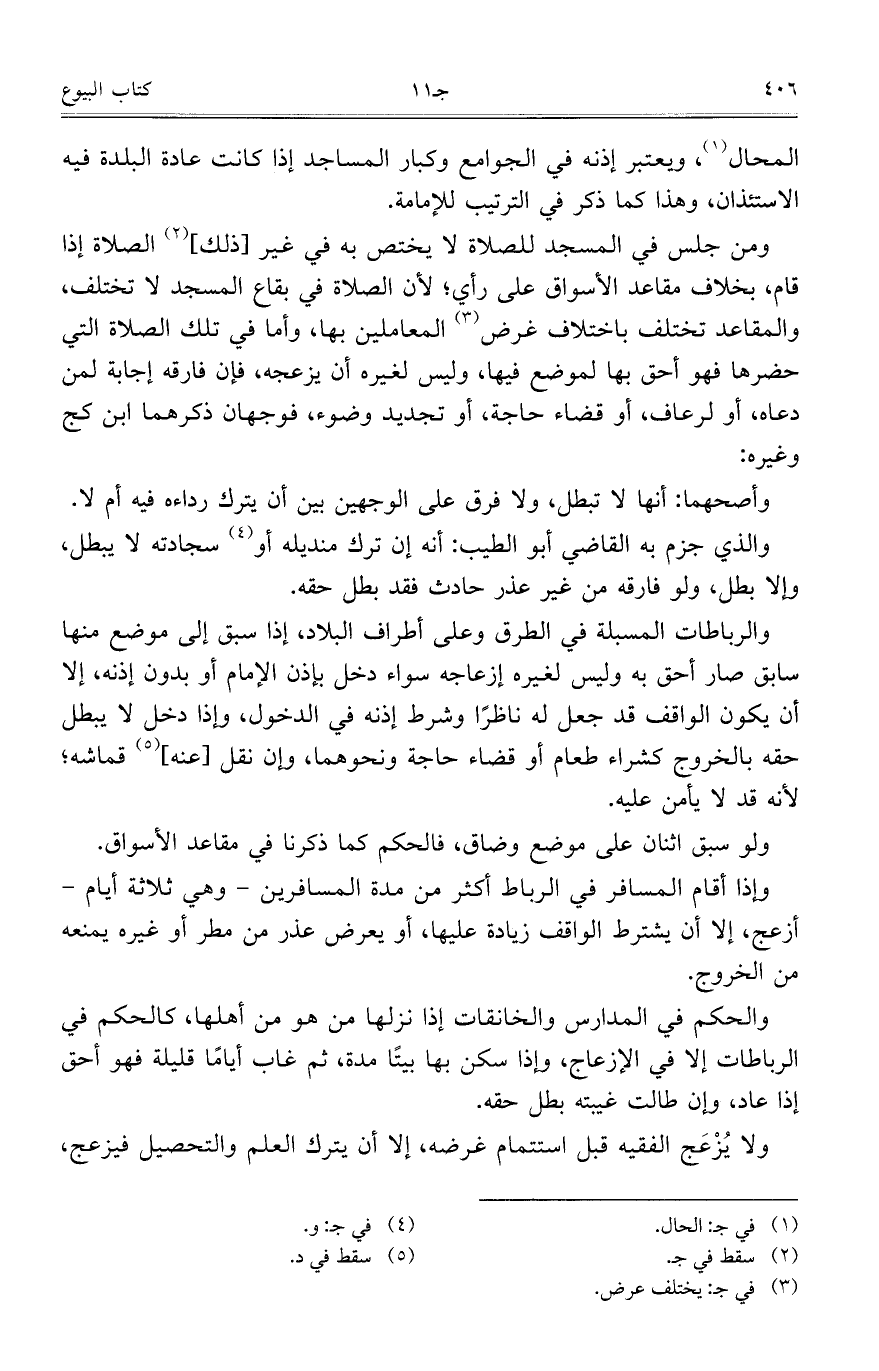 والرباطات المسبلة في الطرق وعلى أطراف البلاد، إذا سبق إلى موضع منها سابق صار أحق به وليس لغيره إزعاجه سواء دخل بإذن الإمام أو بدون إذنه، إلا أن يكون الواقف قد جعل له ناظراً وشرط إذنه في الدخول، وإذا دخل لا يبطل حقه بالخروج كشراء طعام أو قضاء حاجة ونحوهما، وإن نقل [عنه] قماشه؛ لأنه قد لا يأمن عليه.