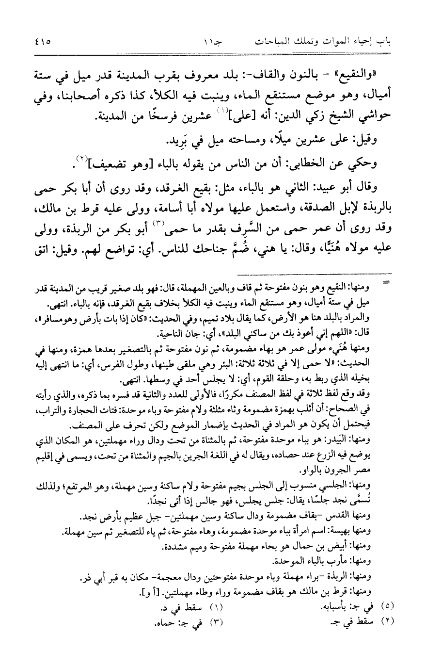 "والنقيع"- بالنون والقاف-: بلد معروف بقرب المدينة قدر ميل في ستة أميال، وهو موضع مستنقع الماء، وينبت فيه الكلأ، كذا ذكره أصحابنا، وفي حواشي الشيخ زكي الدين: أنه [على] عشرين فرسخاً من المدينة.