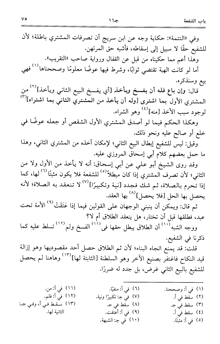 قلت: قد يمنع اتجاه البناء؛ لأن ثم الطلاق حصل أحد مقصوديها وهو إزالة قيد النكاح فاغتفر بصنيع الآخر وهو السلطنة [الثابتة لها] وهاهنا لم يحصل للشفيع بالبيع الثاني غرض، بل جدد له ضرراً.