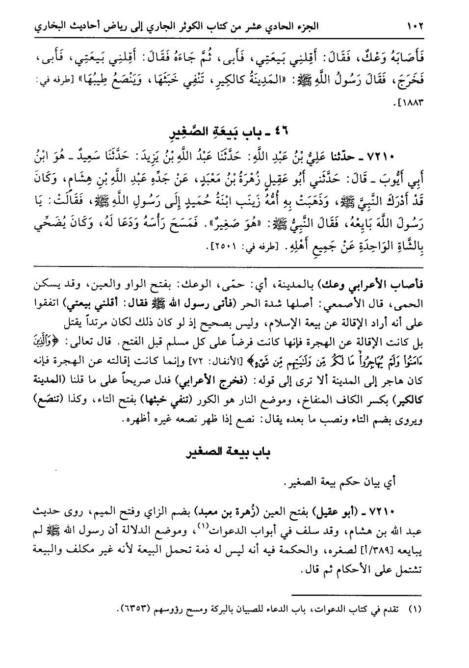 7210 - (أبو عقيل) بفتح العين (زُهرة بن معبد) بضم الزاي وفتح الميم، روى حديث عبد الله بن هشام، وقد سلف في أبواب الدعوات، وموضع الدلالة أن رسول الله - صلى الله عليه وسلم - لم يبايعه لصغره، والحكمة فيه أنه ليس له ذمة تحمل البيعة لأنه غير مكلف والبيعة تشتمل على الأحكام ثم قال.