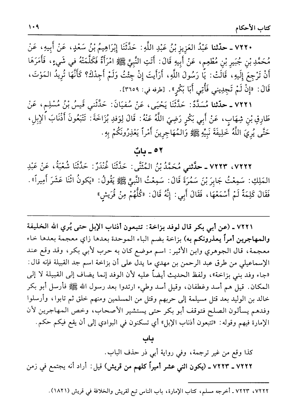 7222 - 7223 - (يكون اثني عشر أميرًا كلهم من قريش) قيل: أراد أنه يجتمع في زمن