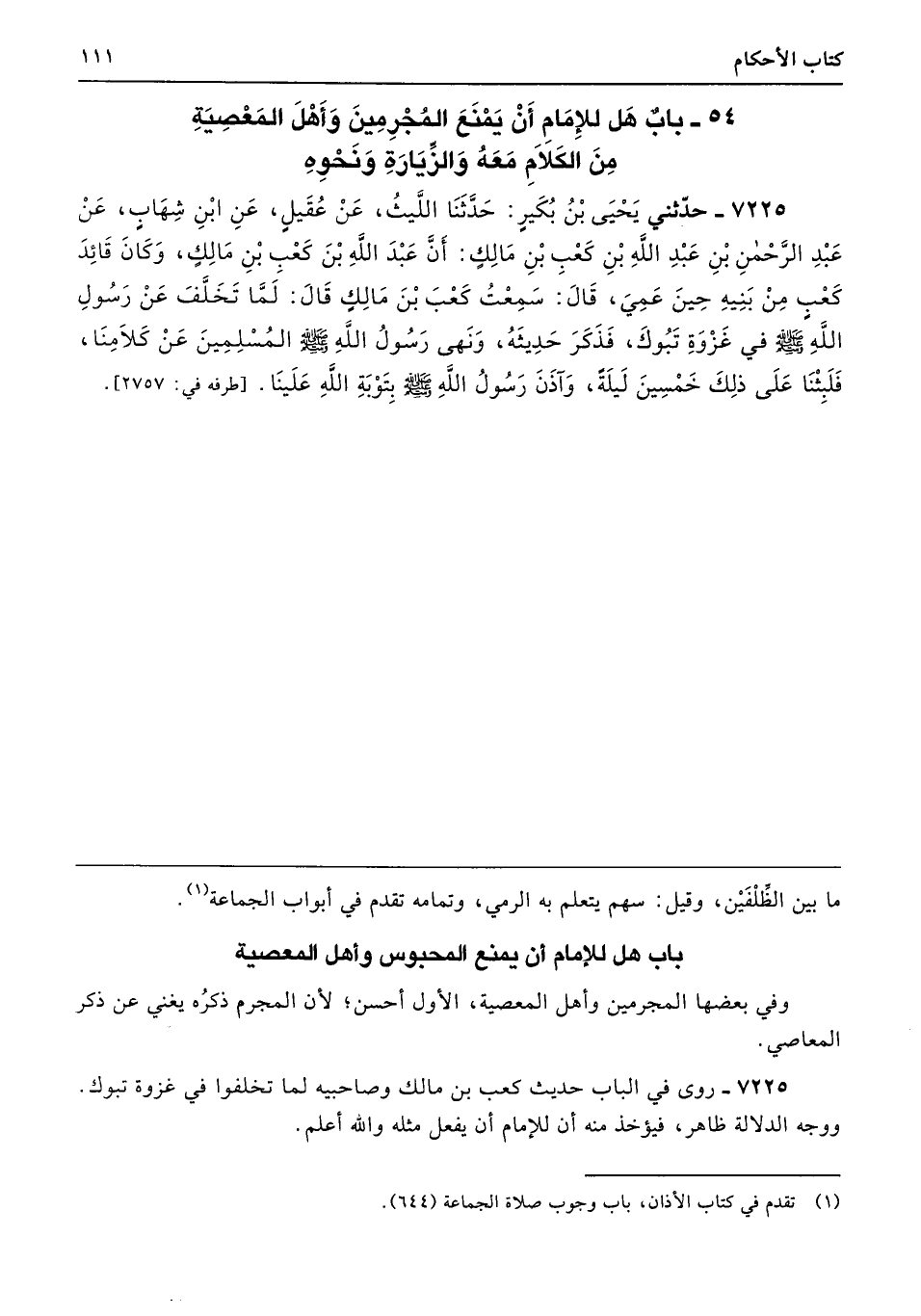 7225 - روى في الباب حديث كعب بن مالك وصاحبيه لما تخلفوا في غزوة تبوك. ووجه الدلالة ظاهر، فيؤخذ منه أن للإمام أن يفعل مثله والله أعلم.