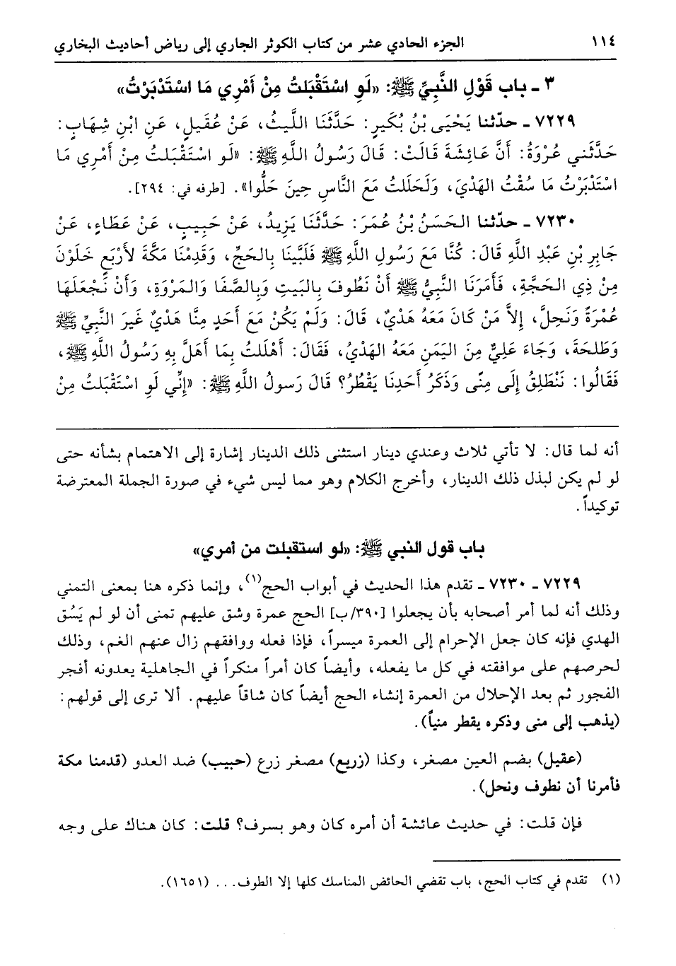 7229 - 7230 - تقدم هذا الحديث في أبواب الحج، وإنما ذكره هنا بمعنى التمني وذلك أنه لما أمر أصحابه بأن يجعلوا الحج عمرة وشق عليهم تمنى أن لو لم يَسُق الهدي فإنه كان جعل الإحرام إلى العمرة ميسرًا، فإذا فعله ووافقهم زال عنهم الغم، وذلك لحرصهم على موافقته في كل ما يفعله، وأيضًا كان أمرًا منكرًا في الجاهلية يعدونه أفجر الفجور ثم بعد الإحلال من العمرة إنشاء الحج أيضًا كان شاقًّا عليهم. ألا ترى إلى قولهم: (يذهب إلى منى وذكره يقطر منيًا).