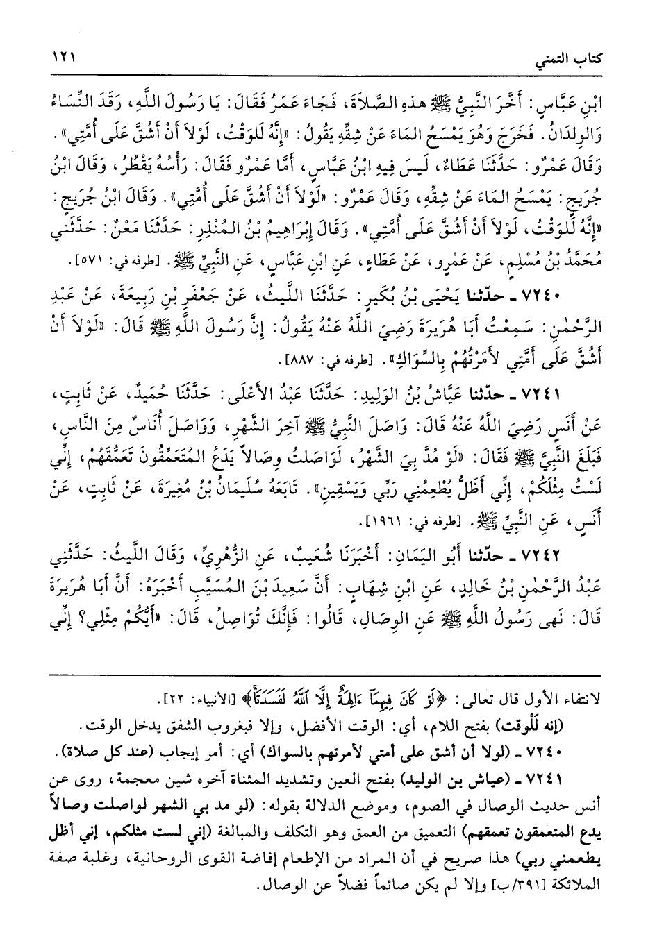 7240 - حَدَّثَنَا يَحْيَى بْنُ بُكَيْرٍ حَدَّثَنَا اللَّيْثُ عَنْ جَعْفَرِ بْنِ رَبِيعَةَ عَنْ عَبْدِ الرَّحْمَنِ سَمِعْتُ أَبَا هُرَيْرَةَ - رضى الله عنه - أَنَّ رَسُولَ اللَّهِ - صلى الله عليه وسلم - قَالَ «لَوْلاَ أَنْ أَشُقَّ عَلَى أُمَّتِى لأَمَرْتُهُمْ بِالسِّوَاكِ». طرفه 887