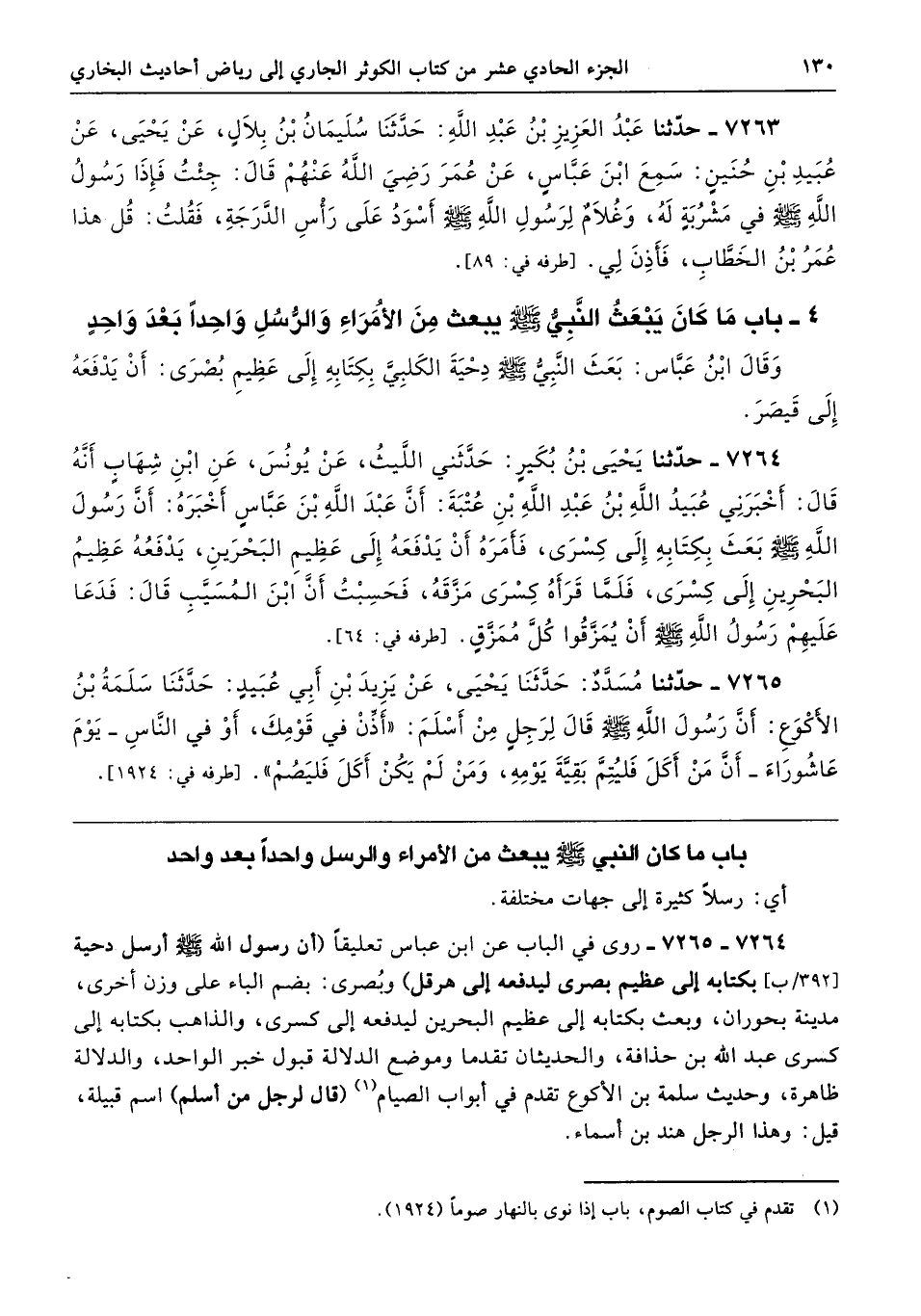 7264 - 7265 - روى في الباب عن ابن عباس تعليقًا (أن رسول الله - صلى الله عليه وسلم - أرسل دحية بكتابه إلى عظيم بصرى ليدفعه إلى هرقل) وبُصرى: بضم الباء على وزن أخرى، مدينة بحوران، وبعث بكتابه إلى عظيم البحرين ليدفعه إلى كسرى، والذاهب بكتابه إلى كسرى عبد الله بن حذافة، والحديثان تقدما وموضع الدلالة قبول خبر الواحد، والدلالة ظاهرة، وحديث سلمة بن الأكوع تقدم في أبواب الصيام (قال لرجل من أسلم) اسم قبيلة، قيل: وهذا الرجل هند بن أسماء.