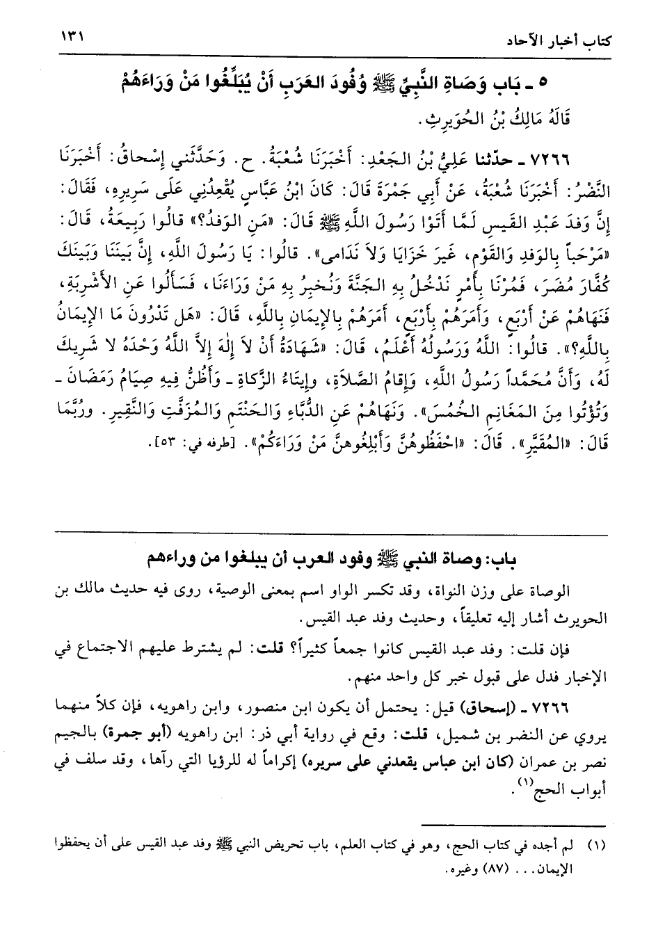 5 - باب وَصَاةِ النَّبِيِّ - صلى الله عليه وسلم - وُفُودَ الْعَرَبِ أَنْ يُبَلِّغُوا مَنْ وَرَاءَهُمْ