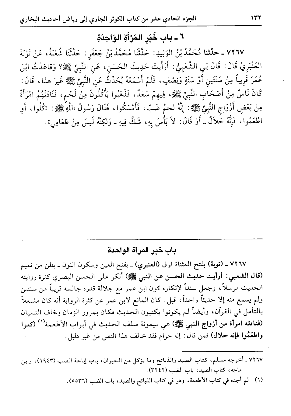 7267 - حَدَّثَنَا مُحَمَّدُ بْنُ الْوَلِيدِ حَدَّثَنَا مُحَمَّدُ بْنُ جَعْفَرٍ حَدَّثَنَا شُعْبَةُ عَنْ تَوْبَةَ الْعَنْبَرِىِّ قَالَ قَالَ لِى الشَّعْبِىُّ أَرَأَيْتَ حَدِيثَ الْحَسَنِ عَنِ النَّبِيِّ - صلى الله عليه وسلم - وَقَاعَدْتُ ابْنَ عُمَرَ قَرِيبًا مِنْ سَنَتَيْنِ أَوْ سَنَةٍ وَنِصْفٍ فَلَمْ أَسْمَعْهُ يُحَدِّثُ عَنِ النَّبِيِّ - صلى الله عليه وسلم - غَيْرَ هَذَا قَالَ كَانَ نَاسٌ مِنْ أَصْحَابِ النَّبِيِّ - صلى الله عليه وسلم - فِيهِمْ سَعْدٌ فَذَهَبُوا يَأْكُلُونَ مِنْ لَحْمٍ، فَنَادَتْهُمُ امْرَأَةٌ مِنْ بَعْضِ أَزْوَاجِ النَّبِيِّ - صلى الله عليه وسلم - إِنَّهُ لَحْمُ ضَبٍّ فَأَمْسَكُوا، فَقَالَ رَسُولُ اللَّهِ - صلى الله عليه وسلم - «كُلُوا - أَوِ اطْعَمُوا - فَإِنَّهُ حَلاَلٌ - أَوْ قَالَ لاَ بَأْسَ بِهِ. شَكَّ فِيهِ - وَلَكِنَّهُ لَيْسَ مِنْ طَعَامِى».