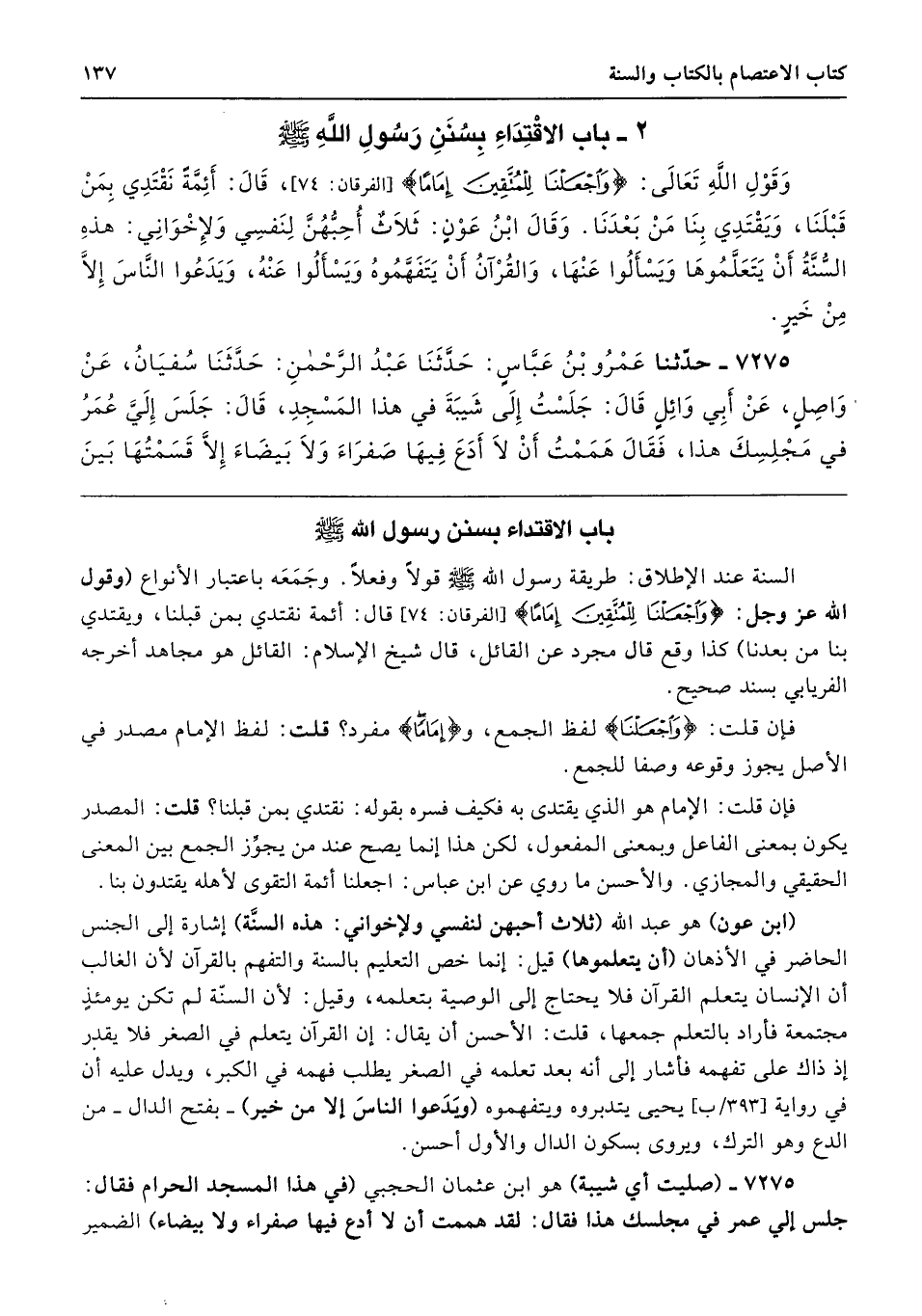 السنة عند الإطلاق: طريقة رسول الله - صلى الله عليه وسلم - قولًا وفعلًا. وجَمَعَه باعتبار الأنواع (وقول الله عز وجل: {وَاجْعَلْنَا لِلْمُتَّقِينَ إِمَامًا} [الفرقان: 74] قال: أئمة نقتدي بمن قبلنا، ويقتدي بنا من بعدنا) كذا وقع قال مجرد عن القائل، قال شيخ الإسلام: القائل هو مجاهد أخرجه الفريابي بسند صحيح.