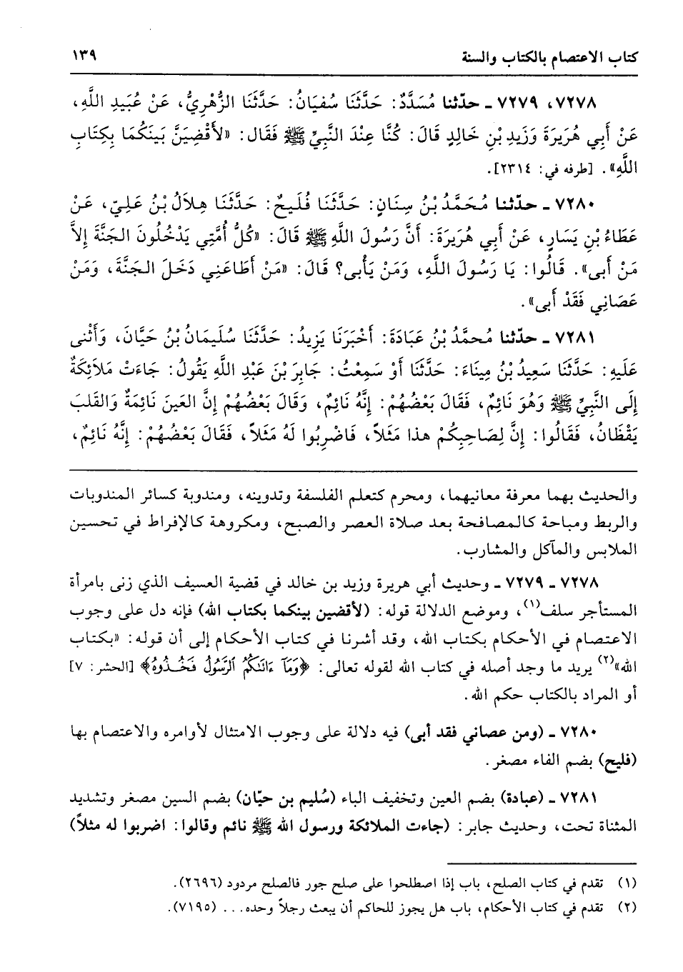 7278 - 7279 - وحديث أبي هريرة وزيد بن خالد في قضية العسيف الذي زنى بامرأة المستأجر سلف، وموضع الدلالة قوله: (لأقضين بينكما بكتاب الله) فإنه دل على وجوب الاعتصام في الأحكام بكتاب الله، وقد أشرنا في كتاب الأحكام إلى أن قوله: "بكتاب الله" يريد ما وجد أصله في كتاب الله لقوله تعالى: {وَمَا آتَاكُمُ الرَّسُولُ فَخُذُوهُ} [الحشر: 7] أو المراد بالكتاب حكم الله.