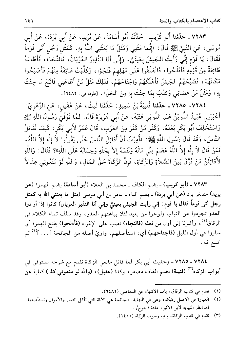 7284 - 7285 - وحديث أبي بكر لما قاتل مانعي الزكاة تقدم مع شرحه مستوفى في أبواب الزكاة (قتيبة) بضم القاف مصغر، وكذا (عقيل)، (والله لو منعوني كذا) كناية عن