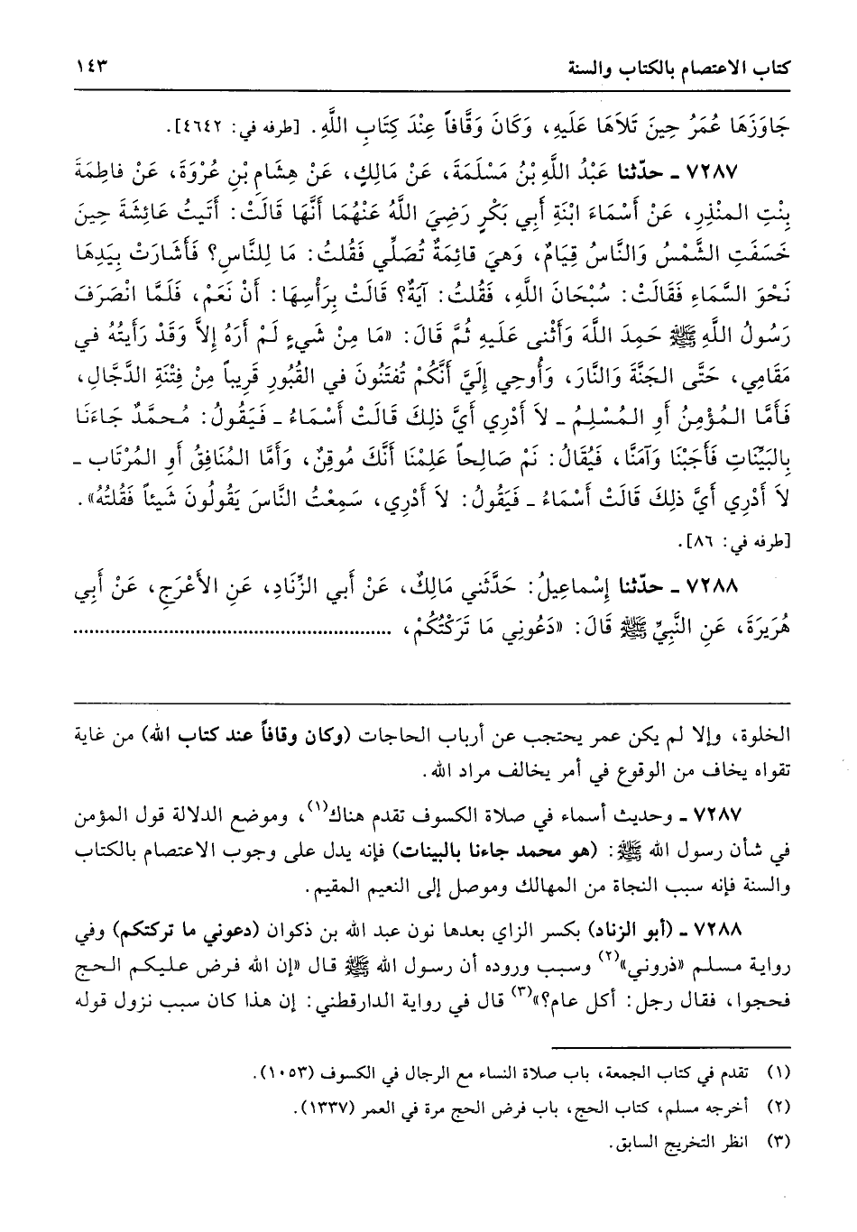 7287 - وحديث أسماء في صلاة الكسوف تقدم هناك، وموضع الدلالة قول المؤمن في شأن رسول الله - صلى الله عليه وسلم -: (هو محمد جاءنا بالبينات) فإنه يدل على وجوب الاعتصام بالكتاب والسنة فإنه سبب النجاة من المهالك وموصل إلى النعيم المقيم.