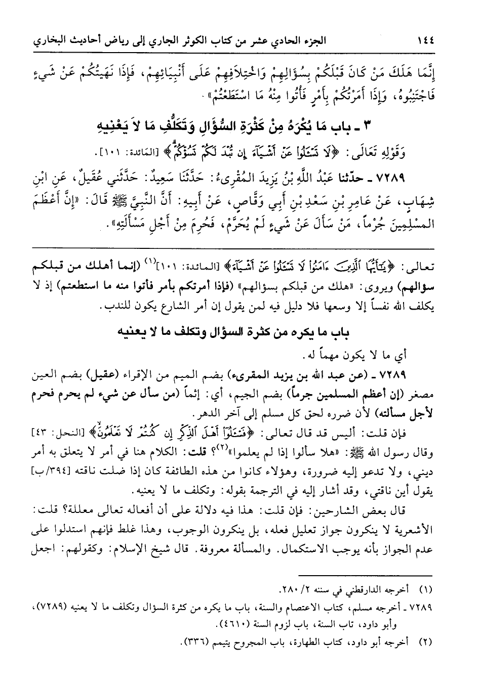 تعالى: {يَاأَيُّهَا الَّذِينَ آمَنُوا لَا تَسْأَلُوا عَنْ أَشْيَاءَ} [المائدة: 101] (إنما أهلك من قبلكم سؤالهم) ويروى: "هلك من قبلكم بسؤالهم" (فإذا أمرتكم بأمر فأتوا منه ما استطعتم) إذ لا يكلف الله نفسًا إلا وسعها فلا دليل فيه لمن يقول إن أمر الشارع يكون للندب.