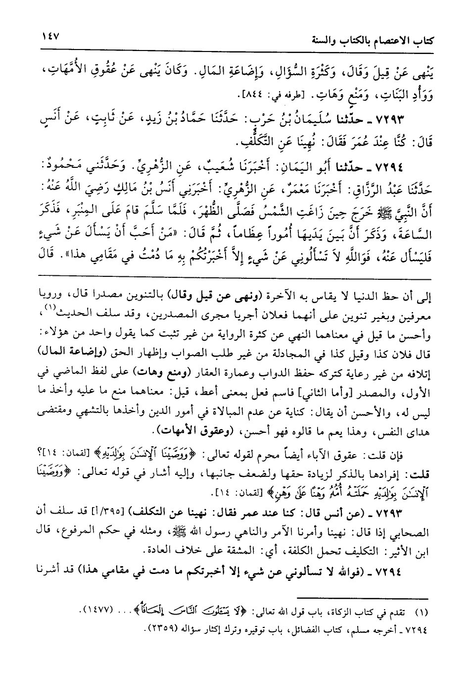 7293 - (عن أنس قال: كنا عند عمر فقال: نهينا عن التكلف) قد سلف أن الصحابي إذا قال: نهينا وأمرنا الآمر والناهي رسول الله - صلى الله عليه وسلم -، ومثله في حكم المرفوع، قال ابن الأثير: التكليف تحمل الكلفة، أي: المشقة على خلاف العادة.