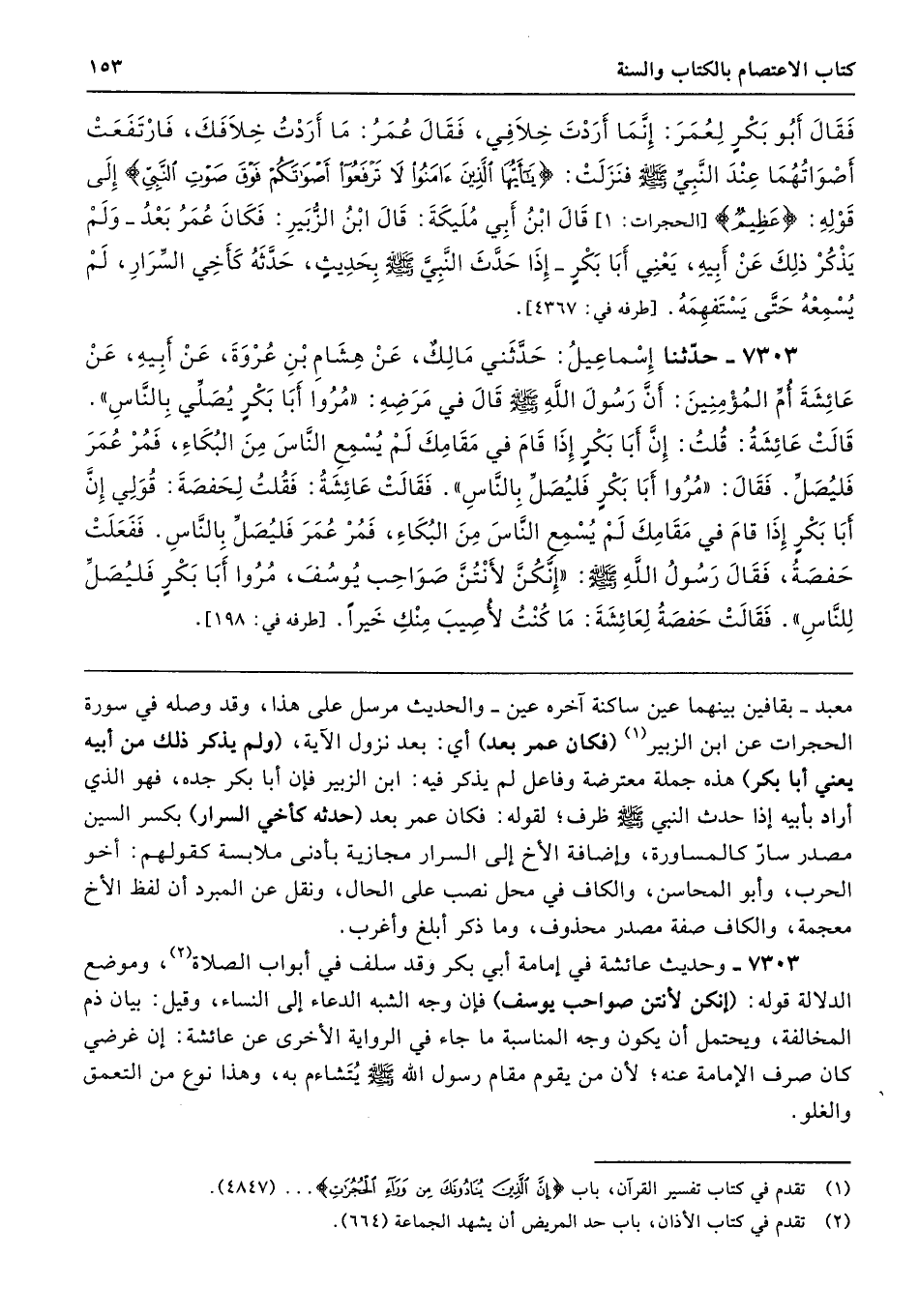 7303 - وحديث عائشة في إمامة أبي بكر وقد سلف في أبواب الصلاة، وموضع الدلالة قوله: (إنكن لأنتن صواحب يوسف) فإن وجه الشبه الدعاء إلى النساء، وقيل: بيان ذم المخالفة، ويحتمل أن يكون وجه المناسبة ما جاء في الرواية الأخرى عن عائشة: إن غرضي كان صرف الإمامة عنه؛ لأن من يقوم مقام رسول الله - صلى الله عليه وسلم - يُتَشاءم به، وهذا نوع من التعمق والغلو.