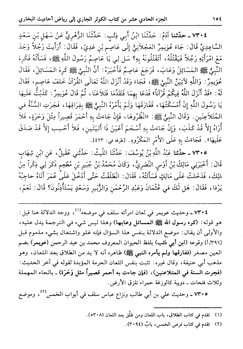7304 - حَدَّثَنَا آدَمُ حَدَّثَنَا ابْنُ أَبِى ذِئْبٍ حَدَّثَنَا الزُّهْرِىُّ عَنْ سَهْلِ بْنِ سَعْدٍ السَّاعِدِىِّ قَالَ جَاءَ عُوَيْمِرٌ إِلَى عَاصِمِ بْنِ عَدِىٍّ فَقَالَ أَرَأَيْتَ رَجُلاً وَجَدَ مَعَ امْرَأَتِهِ رَجُلاً فَيَقْتُلُهُ، أَتَقْتُلُونَهُ بِهِ سَلْ لِى يَا عَاصِمُ رَسُولَ اللَّهِ - صلى الله عليه وسلم - فَسَأَلَهُ فَكَرِهَ النَّبِىُّ - صلى الله عليه وسلم - الْمَسَائِلَ وَعَابَ، فَرَجَعَ عَاصِمٌ فَأَخْبَرَهُ أَنَّ النَّبِىَّ - صلى الله عليه وسلم - كَرِهَ الْمَسَائِلَ فَقَالَ عُوَيْمِرٌ وَاللَّهِ لآتِيَنَّ النَّبِىَّ - صلى الله عليه وسلم -، فَجَاءَ وَقَدْ أَنْزَلَ اللَّهُ تَعَالَى الْقُرْآنَ خَلْفَ عَاصِمٍ فَقَالَ لَهُ «قَدْ أَنْزَلَ اللَّهُ فِيكُمْ قُرْآنًا». فَدَعَا بِهِمَا فَتَقَدَّمَا فَتَلاَعَنَا، ثُمَّ قَالَ عُوَيْمِرٌ كَذَبْتُ عَلَيْهَا يَا رَسُولَ اللَّهِ، إِنْ أَمْسَكْتُهَا. فَفَارَقَهَا وَلَمْ يَأْمُرْهُ النَّبِىُّ - صلى الله عليه وسلم - بِفِرَاقِهَا، فَجَرَتِ السُّنَّةُ فِي الْمُتَلاَعِنَيْنِ. وَقَالَ النَّبِىُّ - صلى الله عليه وسلم - «انْظُرُوهَا فَإِنْ جَاءَتْ بِهِ أَحْمَرَ قَصِيرًا مِثْلَ وَحَرَةٍ فَلاَ أُرَاهُ إِلاَّ قَدْ كَذَبَ، وَإِنْ جَاءَتْ بِهِ أَسْحَمَ أَعْيَنَ ذَا أَلْيَتَيْنِ فَلاَ أَحْسِبُ إِلاَّ قَدْ صَدَقَ عَلَيْهَا». فَجَاءَتْ بِهِ عَلَى الأَمْرِ الْمَكْرُوهِ. طرفه 423