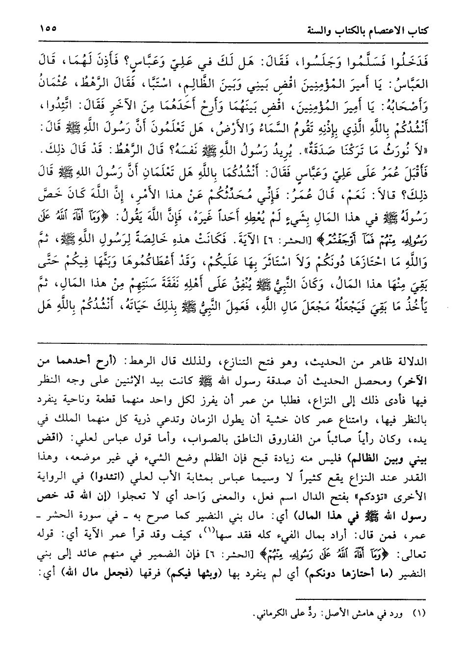 الدلالة ظاهر من الحديث، وهو فتح التنازع، ولذلك قال الرهط: (أرح أحدهما من الآخر) ومحصل الحديث أن صدقة رسول الله- صلى الله عليه وسلم -كانت بيد الإثنين على وجه النظر فيها فأدى ذلك إلى النزاع، فطلبا من عمر أن يفوز لكل واحد منهما قطعة وناحية ينفرد بالنظر فيها، وامتناع عمر كان خشية أن يطول الزمان وتدعي ذرية منهما الملك في يده، وكان رأيًا صائبًا من الفاروق الناطق بالصواب، وأما قول عباس لعلي: (أقض بيني وبين الظالم) فليس منه زيادة قبح فإن الظلم وضع الشيء في غير موضعه، وهذا القدر عند النزاع يقع كثيرًا لا وسيما عباس بمثابة الأب لعلي (اتئدوا) في الرواية الأخرى "تؤدكم" بفتح الدال اسم فعل، والمعنى واحد أي لا تعجلوا (إن الله قد خص رسول الله- صلى الله عليه وسلم - في هذا المال) أي: مال بني النضير كما صرح به - في سورة الحشر- عمر، فمن قال: أراد بمال الفيء كله فقد سها، كيف وقد قرأ عمر الآية أي: قوله تعالى: {وَمَا أَفَاءَ اللَّهُ عَلَى رَسُولِهِ مِنْهُمْ} [لحشرة: 6] فإن الضمير في منهم عائد إلى بني النضير (ما أحتازها دونكم) أي لم ينفرد بها (وبثها فيكم) فرقها (فجعل مال الله) أي: