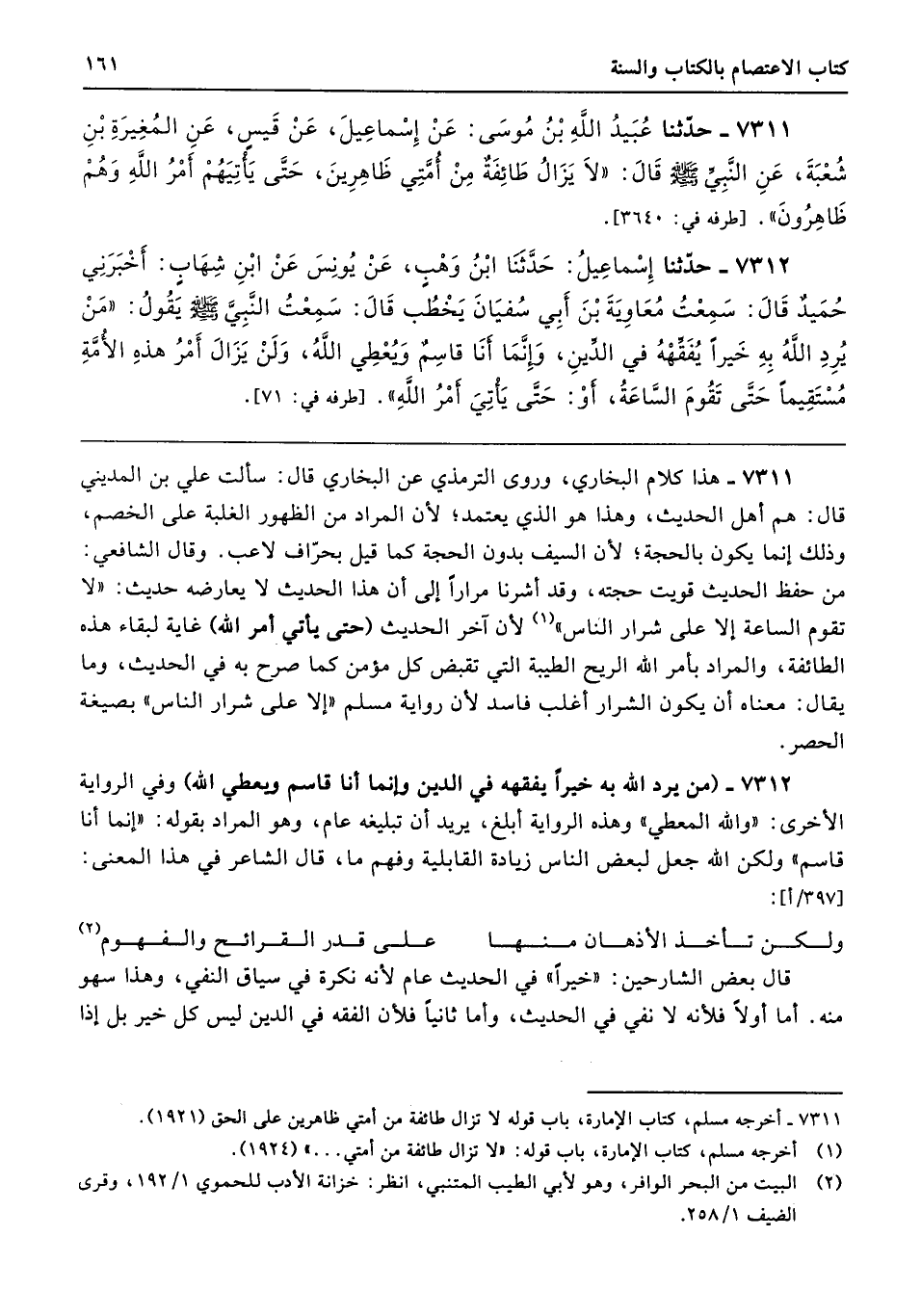 7312 - (من يرد الله به خيرًا يفقهه في الدين وإنما أنا قاسم ويعطي الله) وفي الرواية الأخرى: "والله المعطي" وهذه الرواية أبلغ، يريد أن تبليغه عام، وهو المراد بقوله: "إنما أنا قاسم" ولكن الله جعل لبعض الناس زيادة القابلية وفهم ما، قال الشاعر في هذا المعنى: