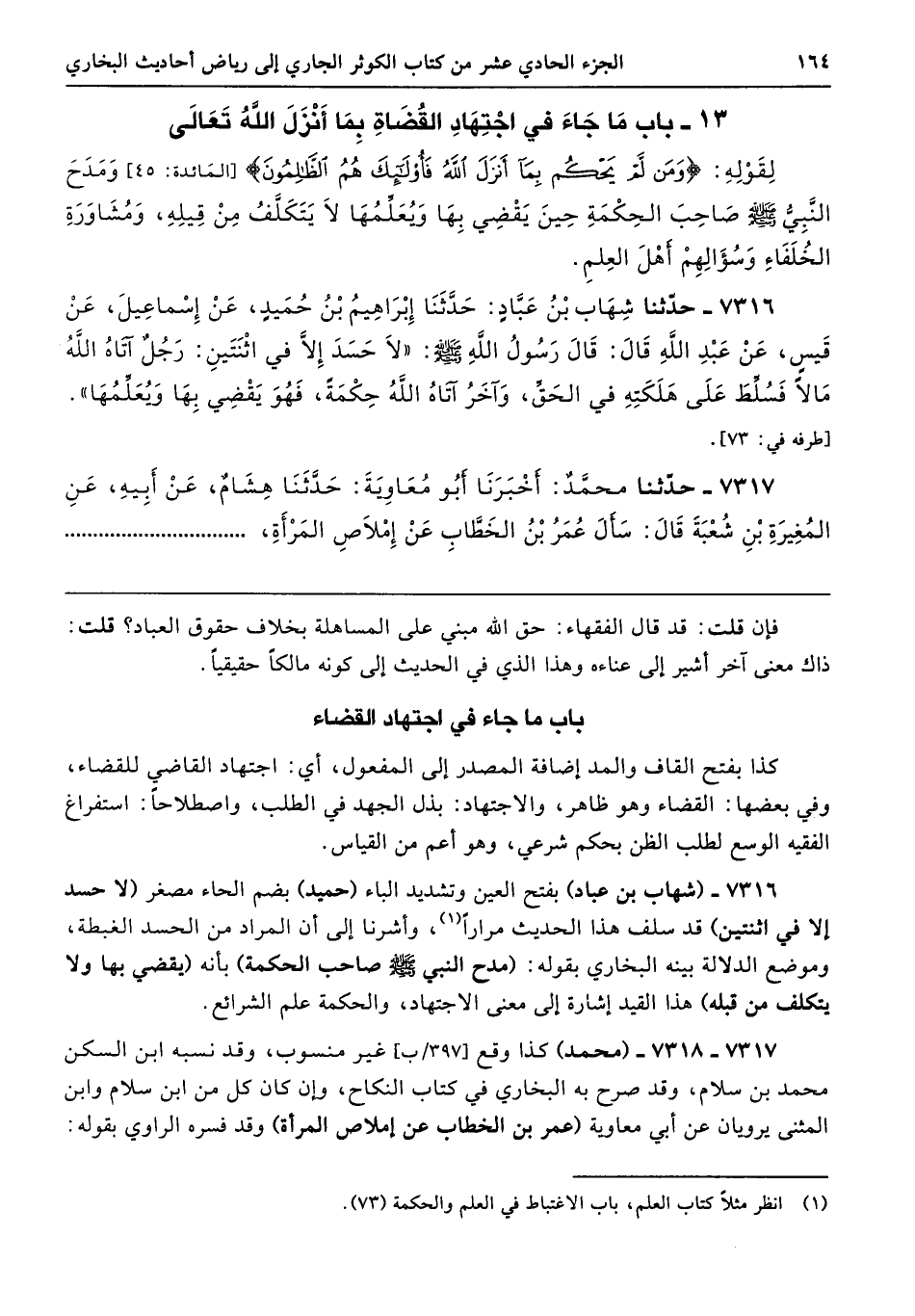 7316 - (شهاب بن عباد) بفتح العين وتشديد الباء (حميد) بضم الحاء مصغر (لا حسد إلا في اثنتين) قد سلف هذا الحديث مرارًا، وأشرنا إلى أن المراد من الحسد الغبطة، وموضع الدلالة بينه البخاري بقوله: (مدح النبي - صلى الله عليه وسلم - صاحب الحكمة) بأنه (يقضي بها ولا يتكلف من قبله) هذا القيد إشارة إلى معنى الاجتهاد، والحكمة علم الشرائع.