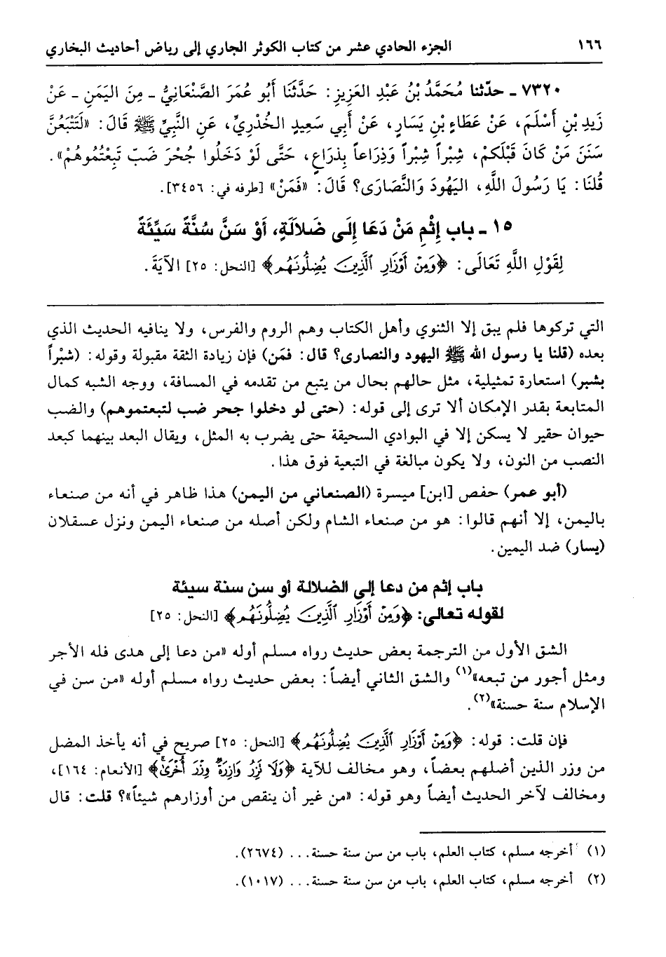 فإن قلت: قوله: {وَمِنْ أَوْزَارِ الَّذِينَ يُضِلُّونَهُمْ} [النحل: 25] صريح في أنه يأخذ المضل من وزر الذين أضلهم بعضًا، وهو مخالف للآية {وَلَا تَزِرُ وَازِرَةٌ وِزْرَ أُخْرَى} [الأنعام: 164] ومخالف لآخر الحديث أيضًا وهو قوله: "من غير أن ينقص من أوزارهم شيئًا" قلت: قال