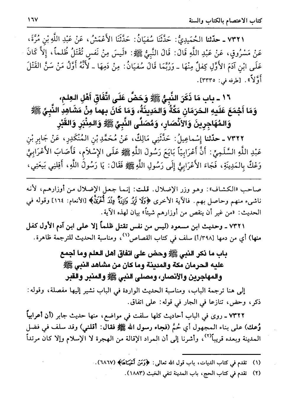 7321 - وحديث ابن مسعود (ليس من نفس تقتل ظلمًا إلا على ابن آدم الأول كفل منها) أي من دمها سلف في كتاب القصاص، ومناسبة الحديث للترجمة ظاهرة.