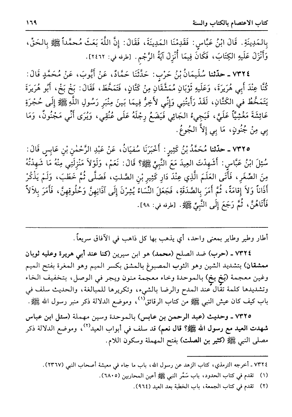 7325 - وحديث (عبد الرحمن بن عابس) بالموحدة وسين مهملة (سئل ابن عباس شهدت العيد مع رسول الله - صلى الله عليه وسلم -؟ قال نعم) قد سلف في أبواب العيد، وموضع الدلالة ذكر مصلى النبي - صلى الله عليه وسلم - (كثير بن الصلت) بفتح المهملة وسكون اللام.