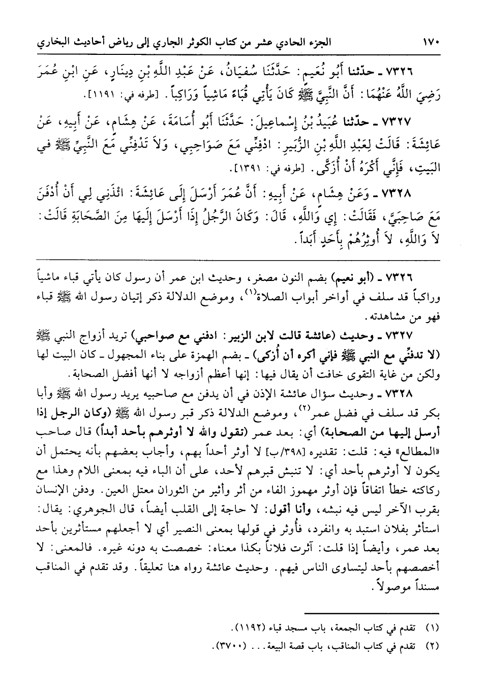 7326 - (أبو نعيم) بضم النون مصغر، وحديث ابن عمر أن رسول كان يأتي قباء ماشيًا وراكبًا قد سلف في أواخر أبواب الصلاة، وموضع الدلالة ذكر إتيان رسول الله - صلى الله عليه وسلم - قباء فهو من مشاهدته.