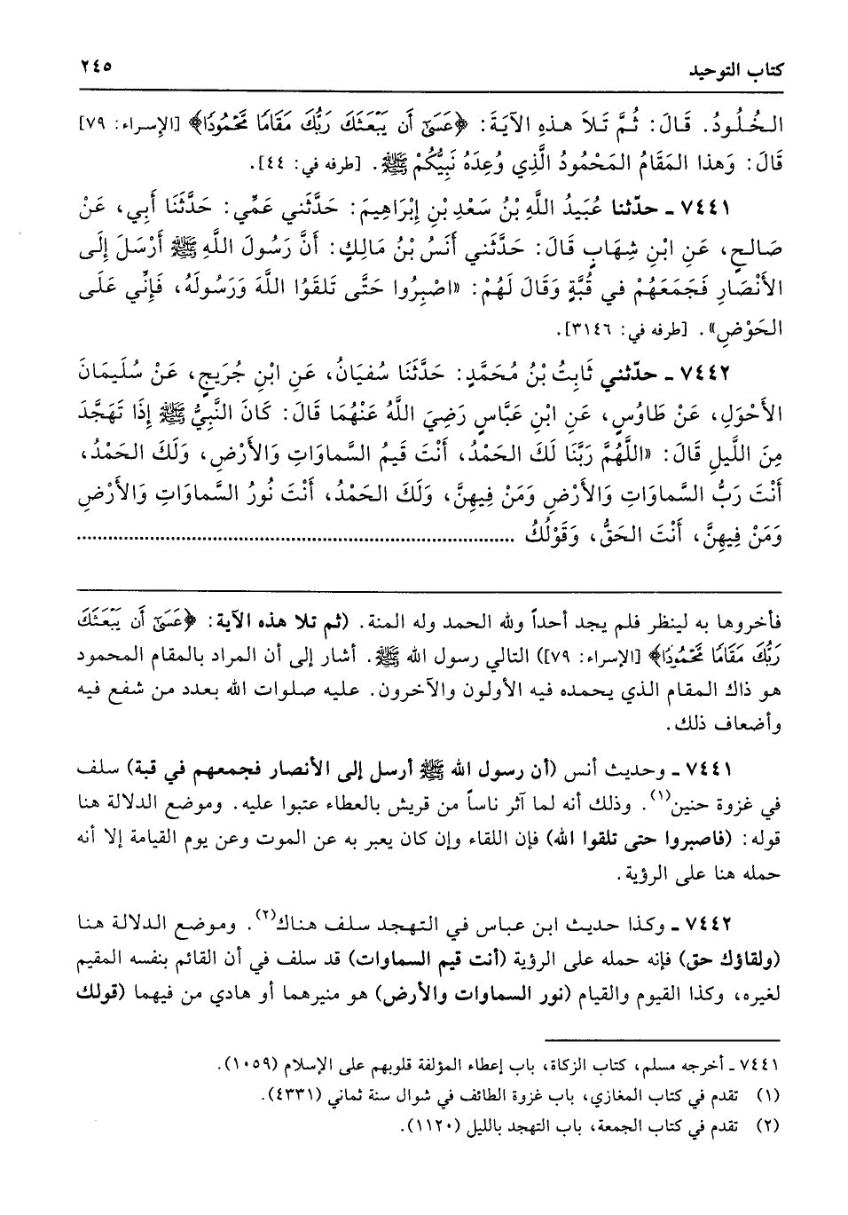 7442 - وكذا حديث ابن عباس في التهجد سلف هناك. وموضع الدلالة هنا (ولقاؤك حق) فإنه حمله على الرؤية (أنت قيم السماوات) قد سلف في أن القائم بنفسه المقيم لغيره، وكذا القيوم والقيام (نور السماوات والأرض) هو منيرهما أو هادي من فيهما (قولك