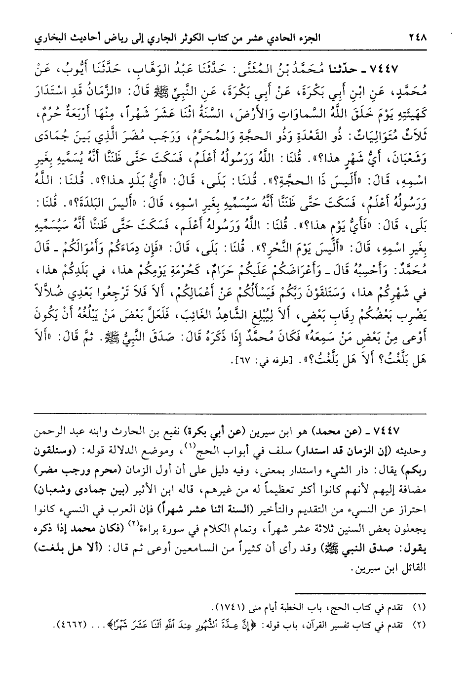 7447 - حَدَّثَنَا مُحَمَّدُ بْنُ الْمُثَنَّى حَدَّثَنَا عَبْدُ الْوَهَّابِ حَدَّثَنَا أَيُّوبُ عَنْ مُحَمَّدٍ عَنِ ابْنِ أَبِى بَكْرَةَ عَنْ أَبِى بَكْرَةَ عَنِ النَّبِيِّ - صلى الله عليه وسلم - قَالَ «الزَّمَانُ قَدِ اسْتَدَارَ كَهَيْئَتِهِ يَوْمَ خَلَقَ اللَّهُ السَّمَوَاتِ وَالأَرْضَ، السَّنَةُ اثْنَا عَشَرَ شَهْرًا، مِنْهَا أَرْبَعَةٌ حُرُمٌ ثَلاَثٌ مُتَوَالِيَاتٌ ذُو الْقَعَدَةِ وَذُو الْحَجَّةِ وَالْمُحَرَّمُ، وَرَجَبُ مُضَرَ الَّذِى بَيْنَ جُمَادَى وَشَعْبَانَ، أَىُّ شَهْرٍ هَذَا». قُلْنَا اللَّهُ وَرَسُولُهُ أَعْلَمُ فَسَكَتَ حَتَّى ظَنَنَّا أَنَّهُ يُسَمِّيهِ بِغَيْرِ اسْمِهِ قَالَ «أَلَيْسَ ذَا الْحَجَّةِ». قُلْنَا بَلَى. قَالَ «أَىُّ بَلَدٍ هَذَا». قُلْنَا اللَّهُ وَرَسُولُهُ أَعْلَمُ. فَسَكَتَ حَتَّى ظَنَنَّا أَنَّهُ سَيُسَمِّيهِ بِغَيْرِ اسْمِهِ قَالَ «أَلَيْسَ الْبَلْدَةَ». قُلْنَا بَلَى. قَالَ «فَأَىُّ يَوْمٍ هَذَا». قُلْنَا اللَّهُ وَرَسُولُهُ أَعْلَمُ فَسَكَتَ حَتَّى ظَنَنَّا أَنَّهُ سَيُسَمِّيهِ بِغَيْرِ اسْمِهِ قَالَ «أَلَيْسَ يَوْمَ النَّحْرِ». قُلْنَا بَلَى. قَالَ «فَإِنَّ دِمَاءَكُمْ وَأَمْوَالَكُمْ - قَالَ مُحَمَّدٌ وَأَحْسِبُهُ قَالَ وَأَعْرَاضَكُمْ - عَلَيْكُمْ حَرَامٌ، كَحُرْمَةِ يَوْمِكُمْ هَذَا فِي بَلَدِكُمْ هَذَا فِي شَهْرِكُمْ هَذَا، وَسَتَلْقَوْنَ رَبَّكُمْ فَيَسْأَلُكُمْ عَنْ أَعْمَالِكُمْ، أَلاَ فَلاَ تَرْجِعُوا بَعْدِى ضُلاَّلاً، يَضْرِبُ بَعْضُكُمْ رِقَابَ بَعْضٍ، أَلاَ لِيُبَلِّغِ الشَّاهِدُ الْغَائِبَ، فَلَعَلَّ بَعْضَ مَنْ يَبْلُغُهُ أَنْ يَكُونَ أَوْعَى مِنْ بَعْضِ مَنْ سَمِعَهُ». فَكَانَ مُحَمَّدٌ إِذَا ذَكَرَهُ قَالَ صَدَقَ النَّبِىُّ - صلى الله عليه وسلم - ثُمَّ قَالَ «أَلاَ هَلْ بَلَّغْتُ أَلاَ هَلْ بَلَّغْتُ». طرفه 67