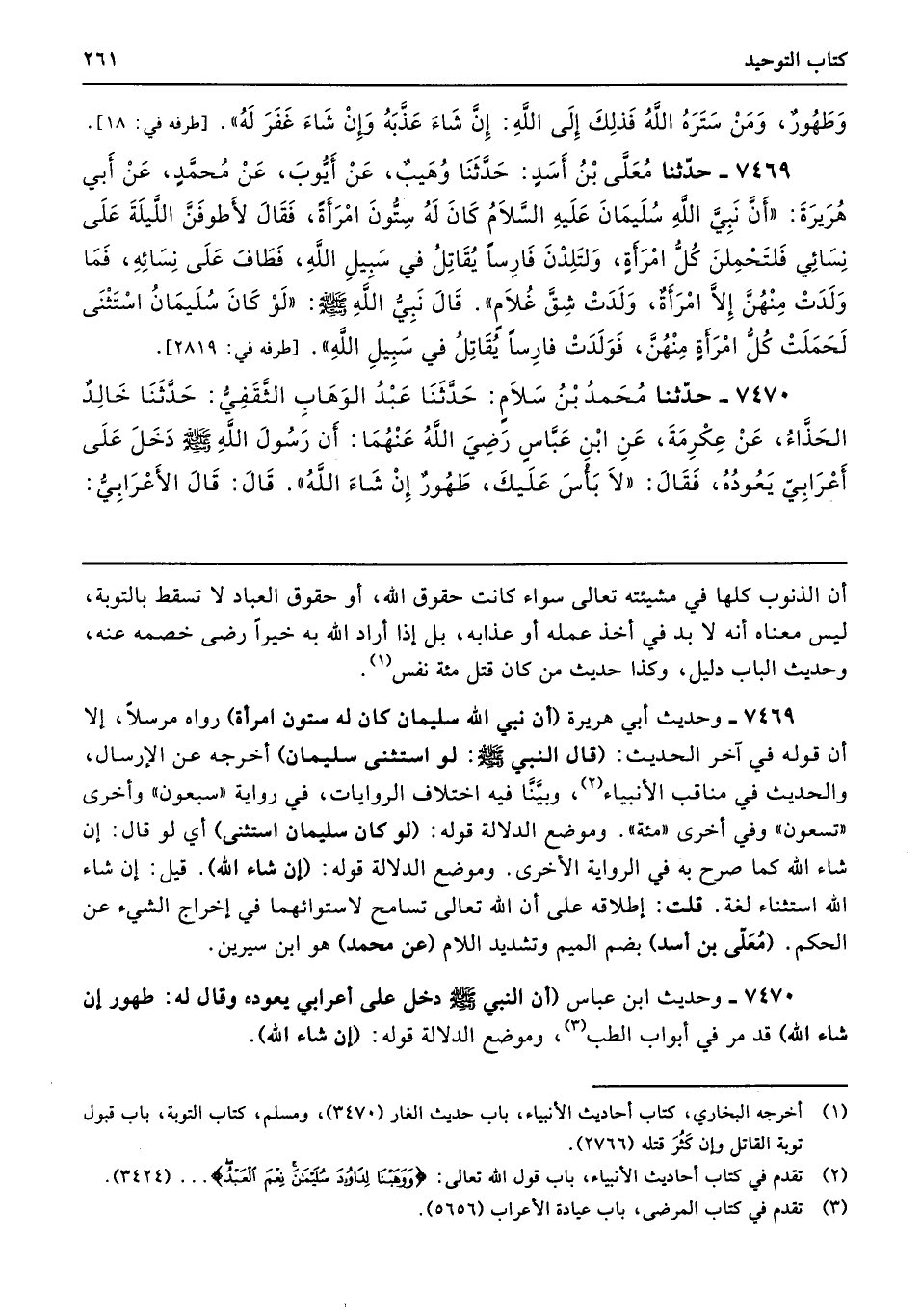 7469 - وحديث أبي هريرة (أن نبي الله سليمان كان له ستون امرأة) رواه مرسلًا، إلا أن قوله في آخر الحديث: (قال النبي -صلى الله عليه وسلم-: لو استثنى سليمان) أخرجه عن الإرسال، والحديث في مناقب الأنبياء، وبيَّنَّا فيه اختلاف الروايات، في رواية "سبعون" وأخرى "تسعون" وفي أخرى "مئة". وموضع الدلالة قوله: (لو كان سليمان استثنى) أي لو قال: إن شاء الله كما صرح به في الرواية الأخرى. وموضع الدلالة قوله: (إن شاء الله). قيل: إن شاء الله استثناء لغة. قلت: إطلاقه على أن الله تعالى تسامح لاستوائهما في إخراج الشيء عن الحكم. (مُعَلّى بن أسد) بضم الميم وتشديد اللام (عن محمد) هو ابن سيرين.