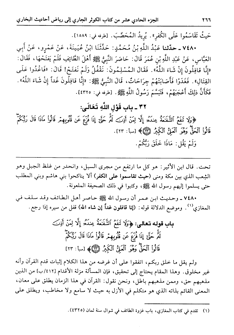 7480 - وحديث ابن عمر أن رسول الله -صلى الله عليه وسلم- حاصر أهل الطائف وقد سلف في المغازي. وموضع الدلالة قوله: (إنا قافلون غدًا إن شاء الله) قفل من سيره إذا رجع.