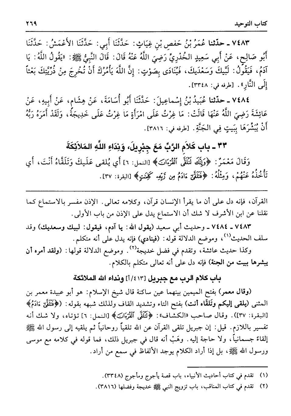 7483 - 7484 - وحديث أبي سعيد (يقول الله: يا آدم، فيقول: لبيك وسعديك) وقد سلف الحديث، وموضع الدلالة قوله: (فينادي) فإنه يدل على أنه متكلم.