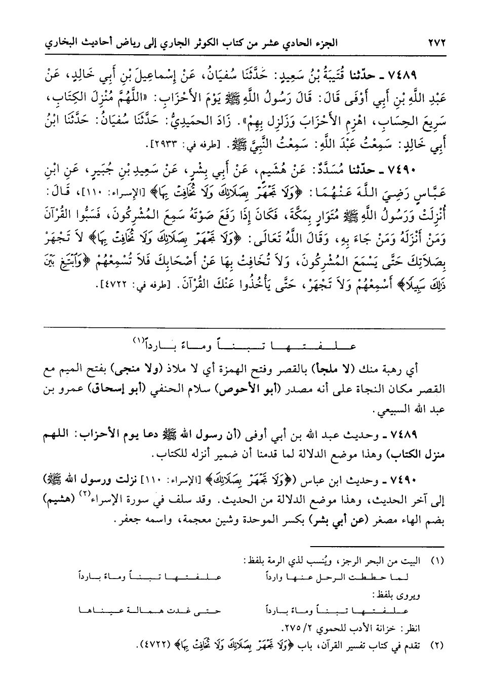 7489 - وحديث عبد الله بن أبي أوفى (أن رسول الله -صلى الله عليه وسلم- دعا يوم الأحزاب: اللهم منزل الكتاب) وهذا موضع الدلالة لما قدمنا أن ضمير أنزله للكتاب.