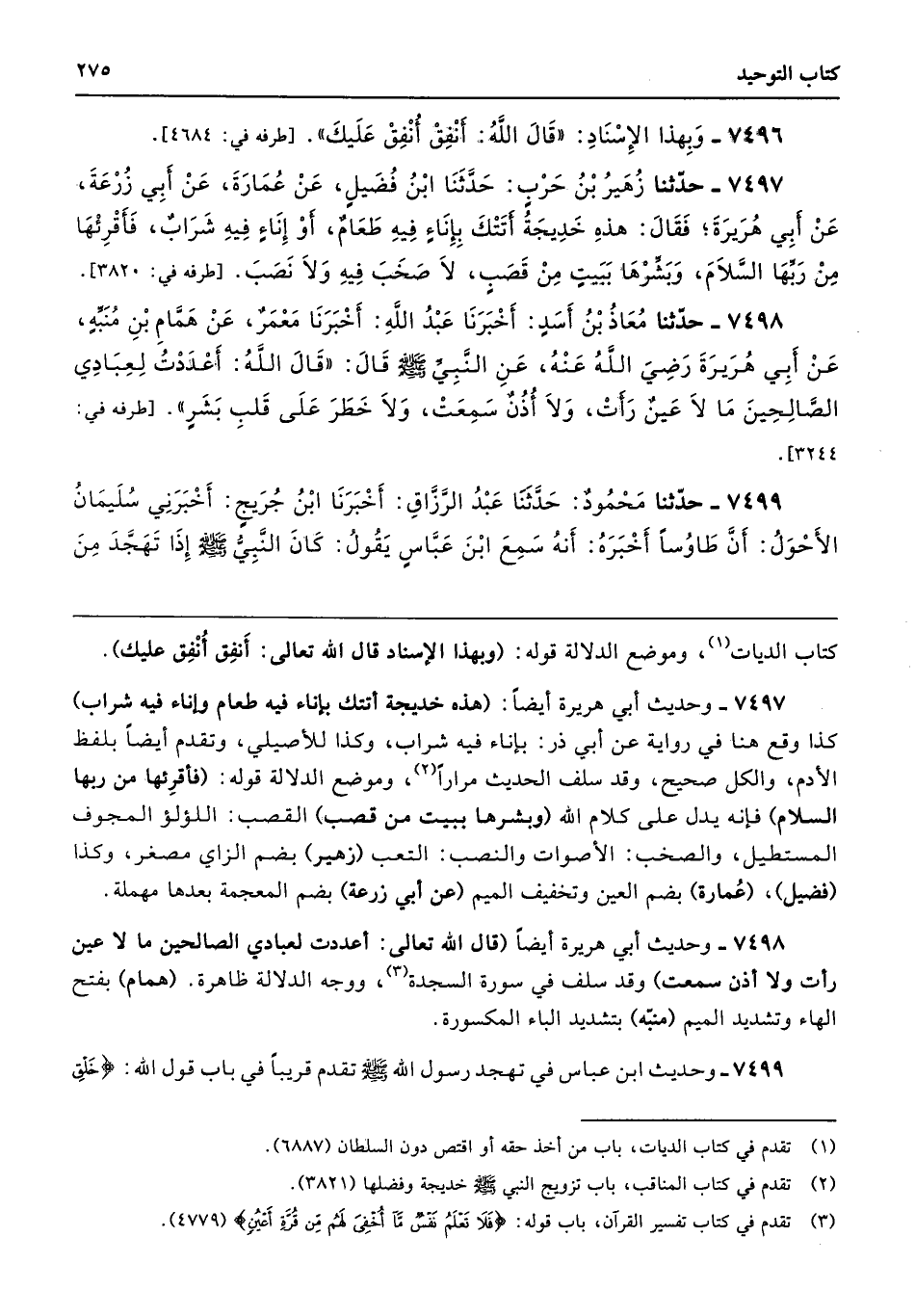 7498 - حَدَّثَنَا مُعَاذُ بْنُ أَسَدٍ أَخْبَرَنَا عَبْدُ اللَّهِ أَخْبَرَنَا مَعْمَرٌ عَنْ هَمَّامِ بْنِ مُنَبِّهٍ عَنْ أَبِى هُرَيْرَةَ - رضى الله عنه - عَنِ النَّبِيِّ - صلى الله عليه وسلم - قَالَ «قَالَ اللَّهُ أَعْدَدْتُ لِعِبَادِى الصَّالِحِينَ مَا لاَ عَيْنٌ رَأَتْ، وَلاَ أُذُنٌ سَمِعَتْ، وَلاَ خَطَرَ عَلَى قَلْبِ بَشَرٍ». طرفه 3244