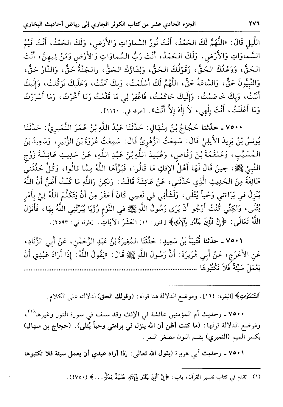 7500 - وحديث أم المؤمنين عائشة في الإفك وقد سلف في سورة النور وغيرها، وموضع الدلالة قولها: (ما كنت أظن أن الله ينزل في براءتي وحيًا يُتلى). (حجاج بن منهال) بكسر الميم (النميري) بضم النون مصغر النمر.