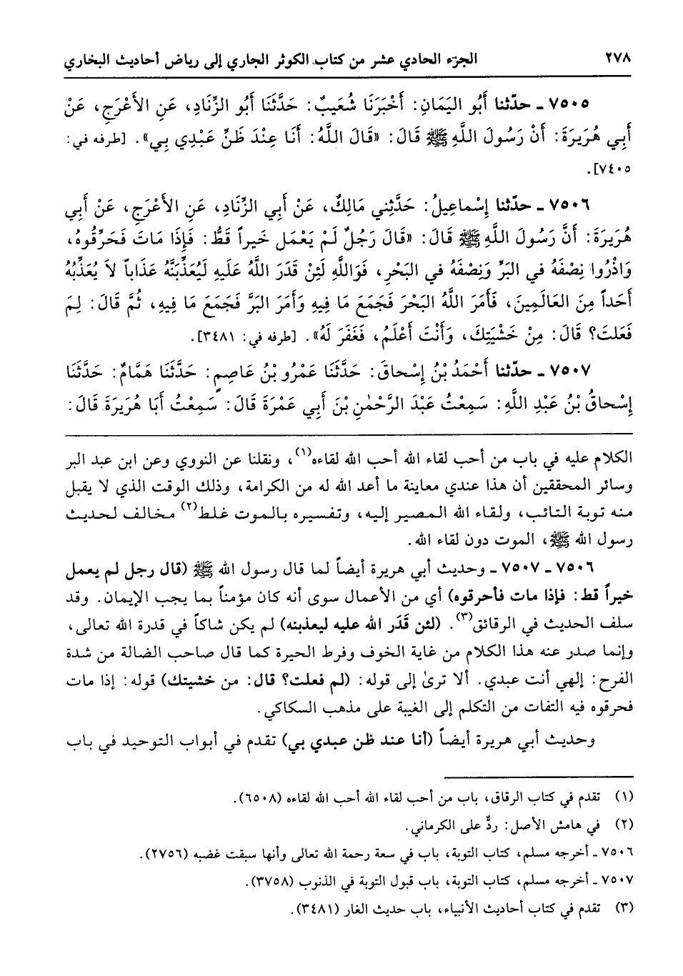 7506 - 7507 - وحديث أبي هريرة أيضًا لما قال رسول الله -صلى الله عليه وسلم- (قال رجل لم يعمل خيرًا قط: فإذا مات فأحرقوه) أي من الأعمال سوى أنه كان مؤمنًا بما يجب الإيمان. وقد سلف الحديث في الرقائق. (لئن قَدَر الله عليه ليعذبنه) لم يكن شاكًّا في قدرة الله تعالى، وإنما صدر عنه هذا الكلام من غاية الخوف وفرط الحيرة كما قال صاحب الضالة من شدة الفرح: إلهي أنت عبدي. ألا ترى إلى قوله: (لم فعلت؟ قال: من خشيتك) قوله: إذا مات فحرقوه فيه التفات من التكلم إلى الغيبة على مذهب السكاكي.